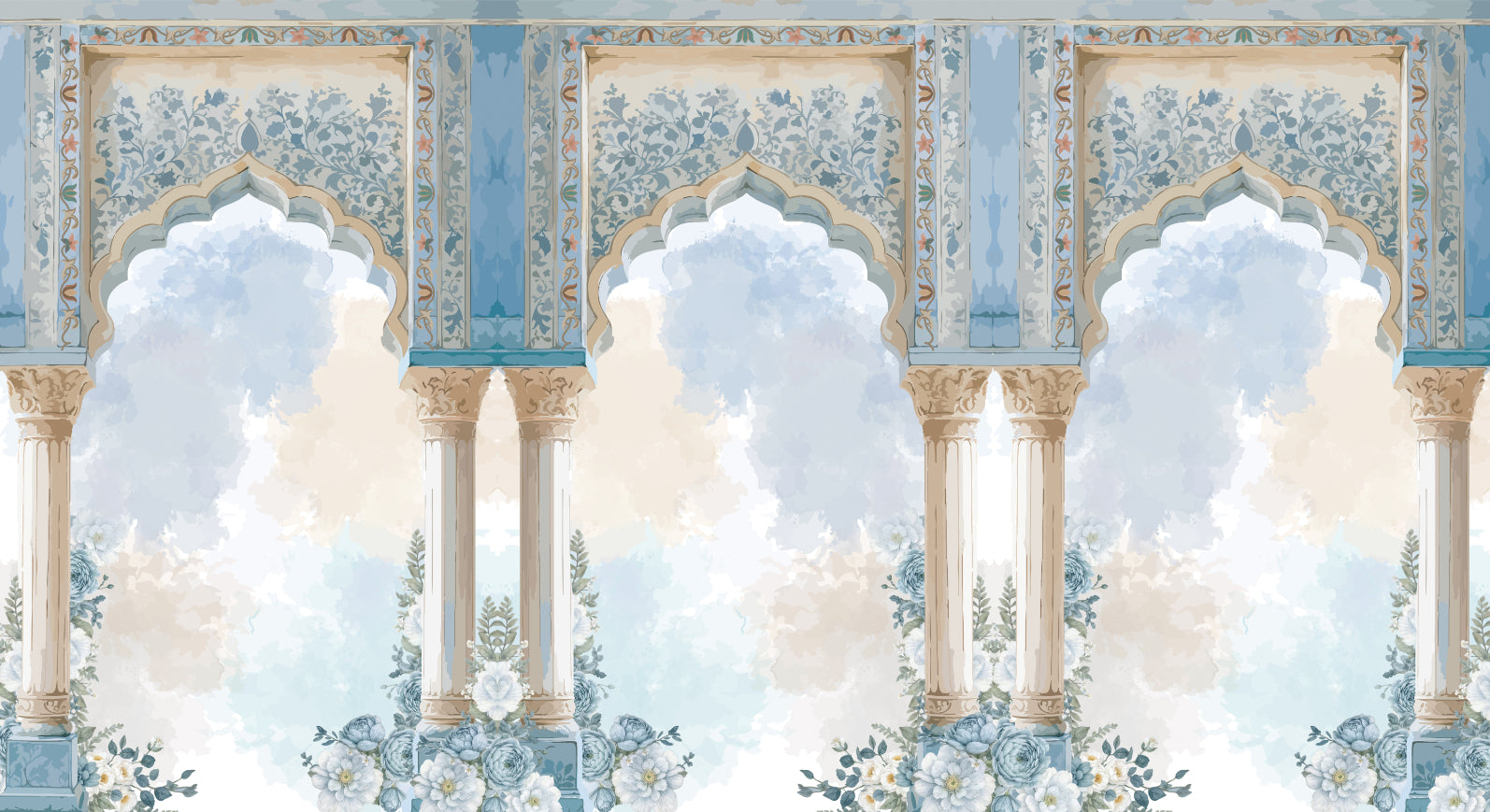 Experience timeless grandeur with the royal Mughal palace arch mural, featuring intricate arches, floral motifs, and regal columns inspired by historic palaces. The elegant blend of soft blues, beige, and gold creates a luxurious setting, bringing an authentic Mughal architecture wallpaper feel. Designed with stunning details, this royal palace mural captures the beauty of traditional craftsmanship. The exquisite archways and floral accents reflect the splendour of bygone eras, making a bold statement. Crafted with precision, this vintage arch design wallpaper transforms any wall into a masterpiece. This classic arched wall mural today captures the essence of heritage and royalty.