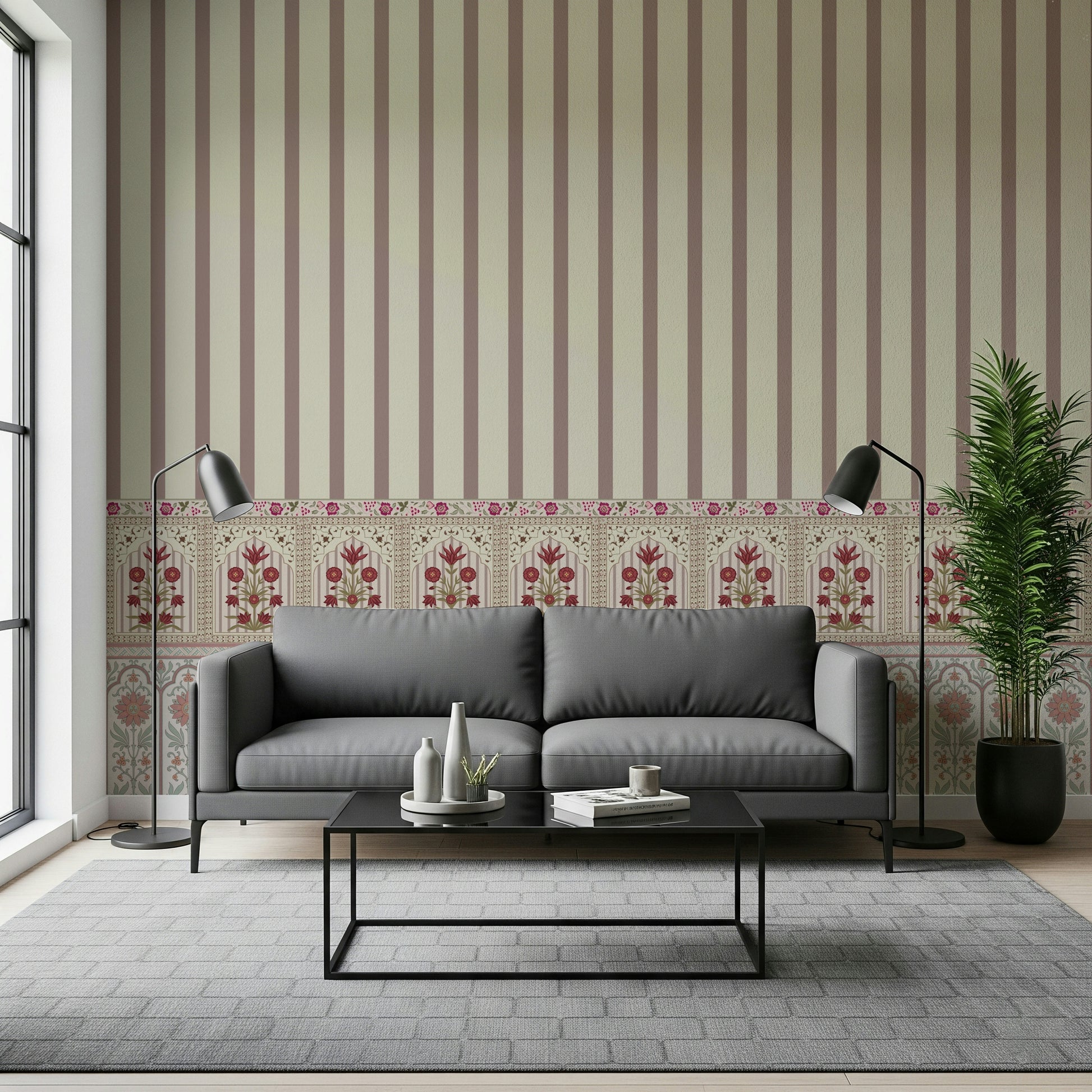 Transform your walls with this regal wallpaper, blending classic stripes with ornate floral details. The design features vertical bands in muted beige and taupe, creating a sophisticated backdrop. Below, intricate floral patterns in shades of pink, green, and burgundy evoke traditional Mughal art. This wallpaper brings an air of historical elegance and refined charm to any room. Ideal for living rooms, dining rooms, or hallways, this design complements both modern and vintage decor, adding a touch of timeless beauty and understated luxury to your home.