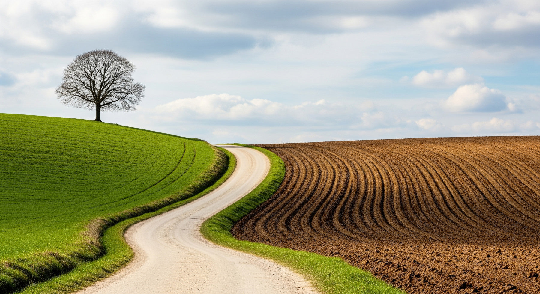 This nature-themed wallpaper creates a calming ambiance. The scene features a winding road cutting through fields under a gentle sky. The bare tree adds a touch of stark beauty, perfect as wallpaper for walls. It enhances a bedroom, living space, or home office with the quiet charm of the countryside. Neutral colors blend into multiple styles of interiors. It offers a simple, refreshing escape from urban spaces, turning walls into portals.