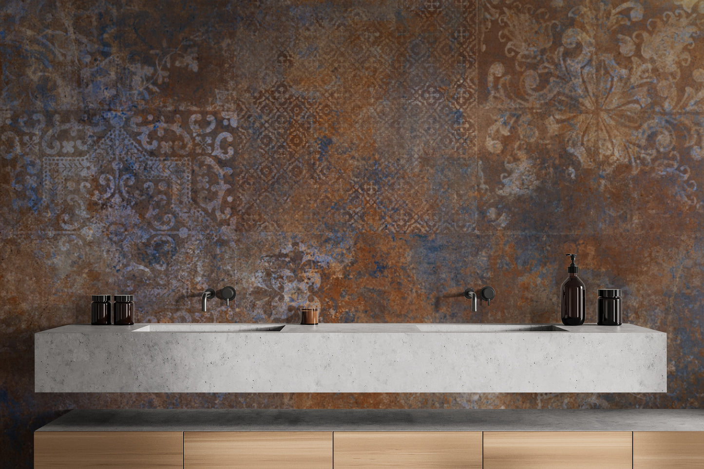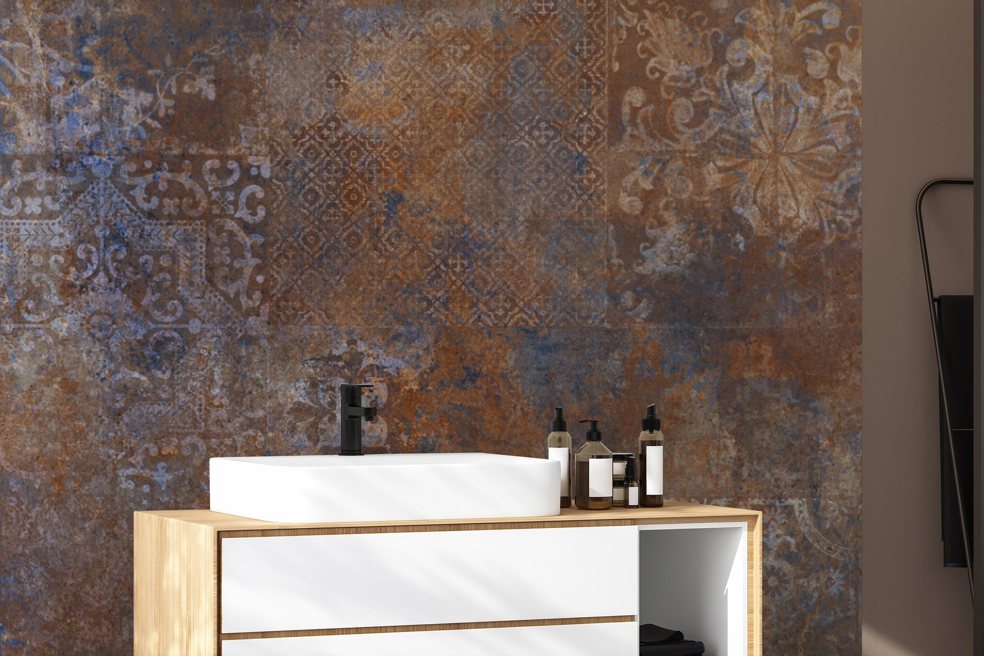 The rustic distressed vintage wallpaper features rich earth tones with hints of blue, creating an aged, textured look perfect for eclectic and industrial interiors. This vintage distressed wallpaper design showcases intricate ornamental patterns that bring a timeless character to any room. The rustic industrial wall covering pairs well with exposed brick, wood, or metal finishes, adding warmth and depth to living rooms, dining areas, or offices. Its aged textured wallpaper with motifs provides a unique, weathered appearance, ideal for vintage-inspired spaces. The faded ornamental wallpaper offers a blend of rustic charm and sophisticated design, perfect for any interior style.