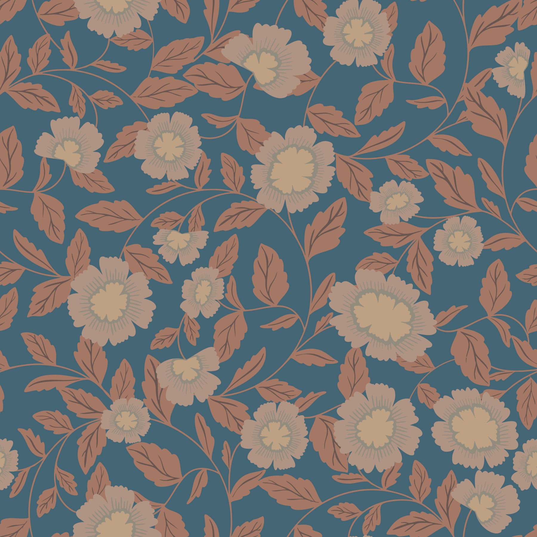 Transform your living space with this charming floral wallpaper for walls. Its design showcases stylised blooms accompanied by foliage in muted brown hues, all set against a deep teal background. The pattern creates an inviting atmosphere for any room. Use it in bedrooms, living rooms, or even hallways to add a touch of rustic style. The colour combination complements wood finishes and natural textures, making it a perfect choice for rustic, farmhouse, and bohemian interiors. The repeat pattern delivers a balanced and cohesive look.