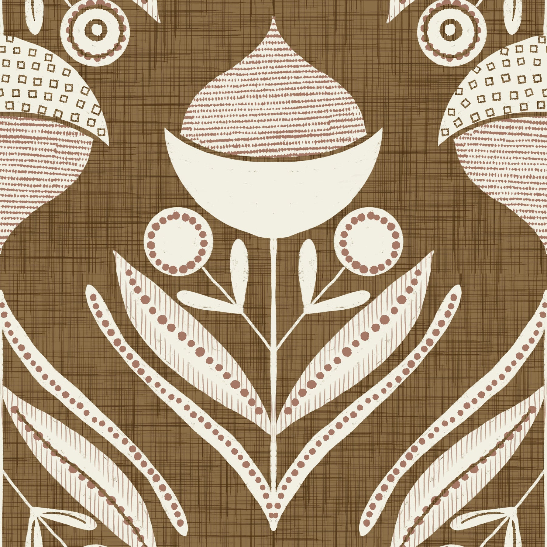 Rustic Floral wallpaper featuring stylized botanical motifs in cream and soft pink on a warm brown background.