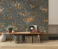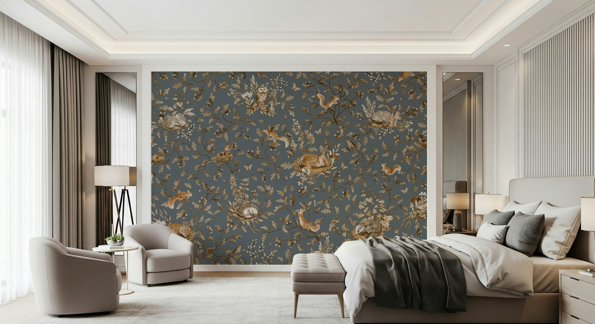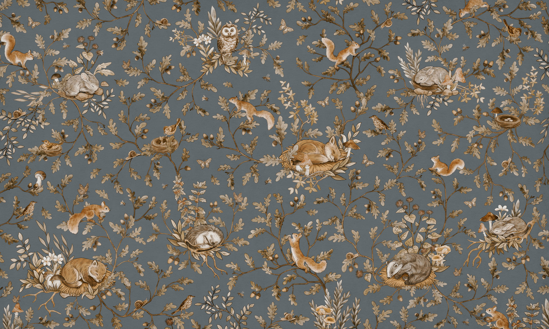 Elevate your home with this vintage animal wallpaper. Explore the delicate details showcasing charming forest inhabitants like squirrels, foxes, and owls amongst stylised oak branches. Earthy browns on a muted grey-blue ground cultivate a rustic and cosy ambiance. This wallpaper for walls works well in living rooms, bedrooms, and nurseries. It enriches interiors with a storybook elegance and provides a calming vibe to any room.
