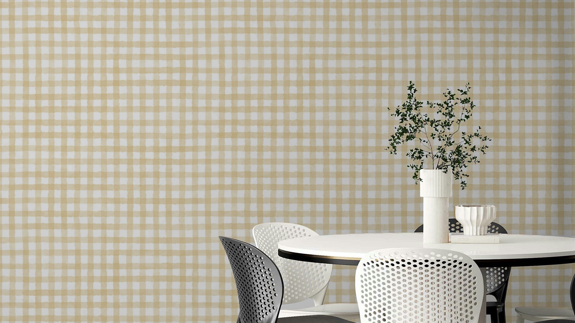 Evoking the charm of a sun-drenched farmhouse kitchen, this wallpaper showcases a classic gingham pattern rendered in soft, watercolor yellows and neutral tones. The hand-painted effect lends a rustic, imperfect beauty to the design, creating a cozy and inviting atmosphere. The subtle checkered pattern adds depth and visual interest without overwhelming the space, making it a versatile backdrop for various decor styles. This wallpaper brings a touch of warmth and timeless elegance to any room, embracing the simple pleasures of country living.