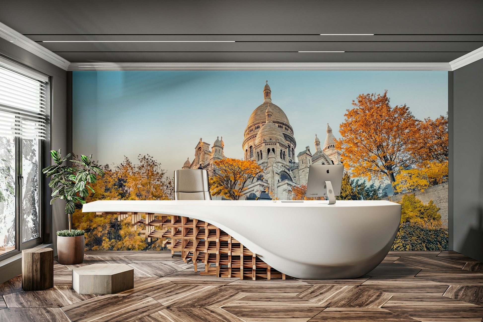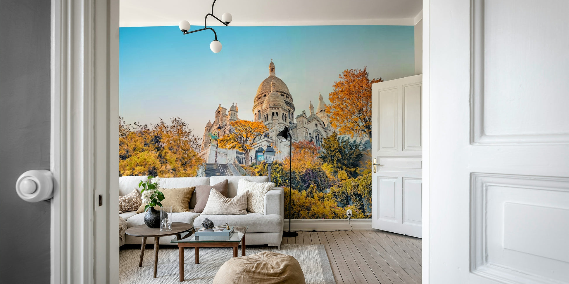 Adorn your home with this captivating wallpaper for walls. This vista showcases the Sacré-Cœur Basilica bathed in a warm, inviting light. The juxtaposition of natural and man-made beauty radiates harmony and grace, complementing modern, classic, and even industrial-styled interiors. The building's grandeur, coupled with the surrounding trees, creates a serene atmosphere. It is ideal for a living room, entryway, or study, adding a touch of Parisian charm.