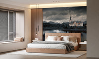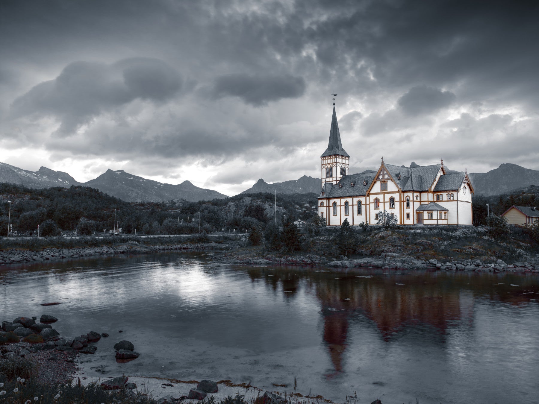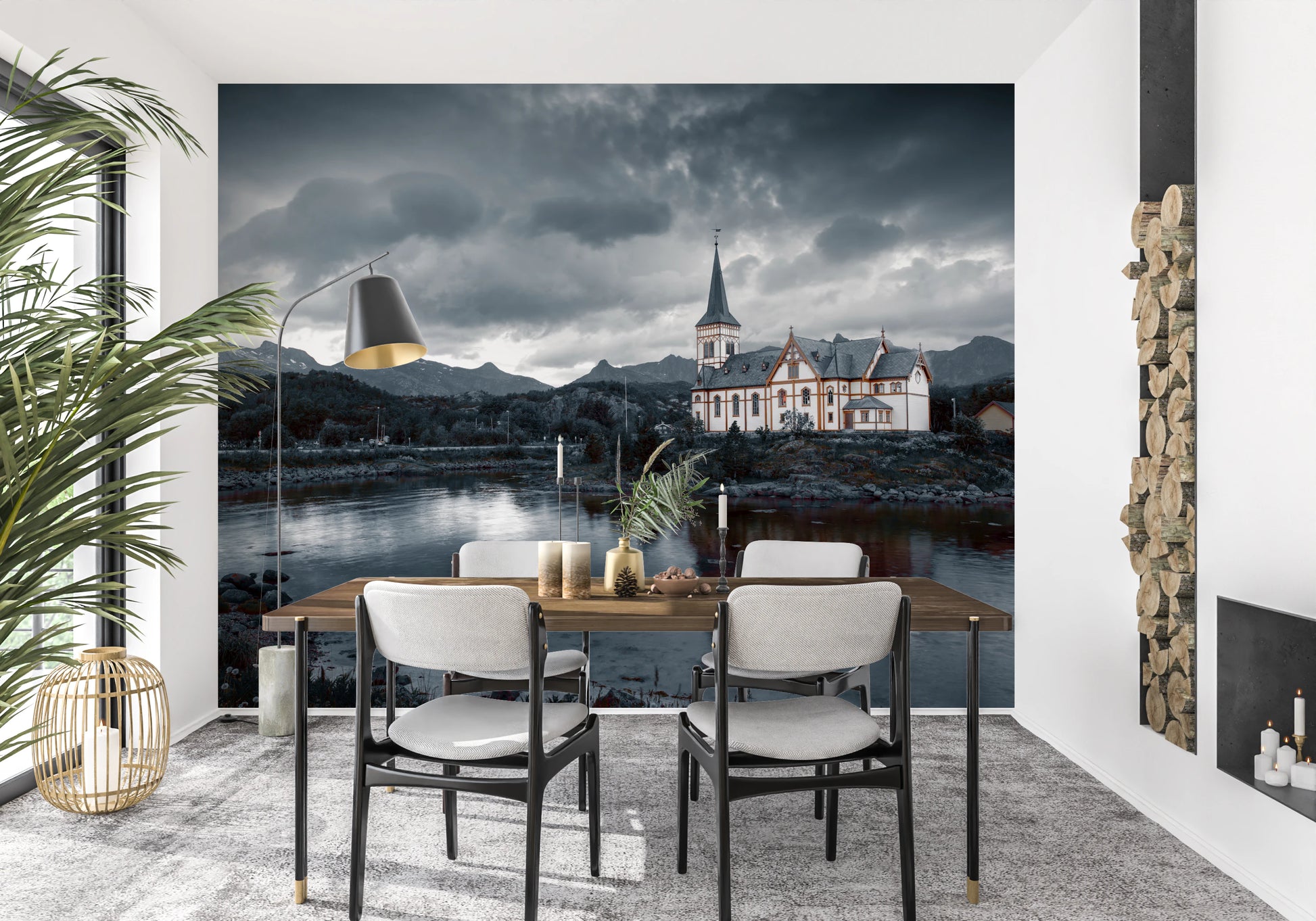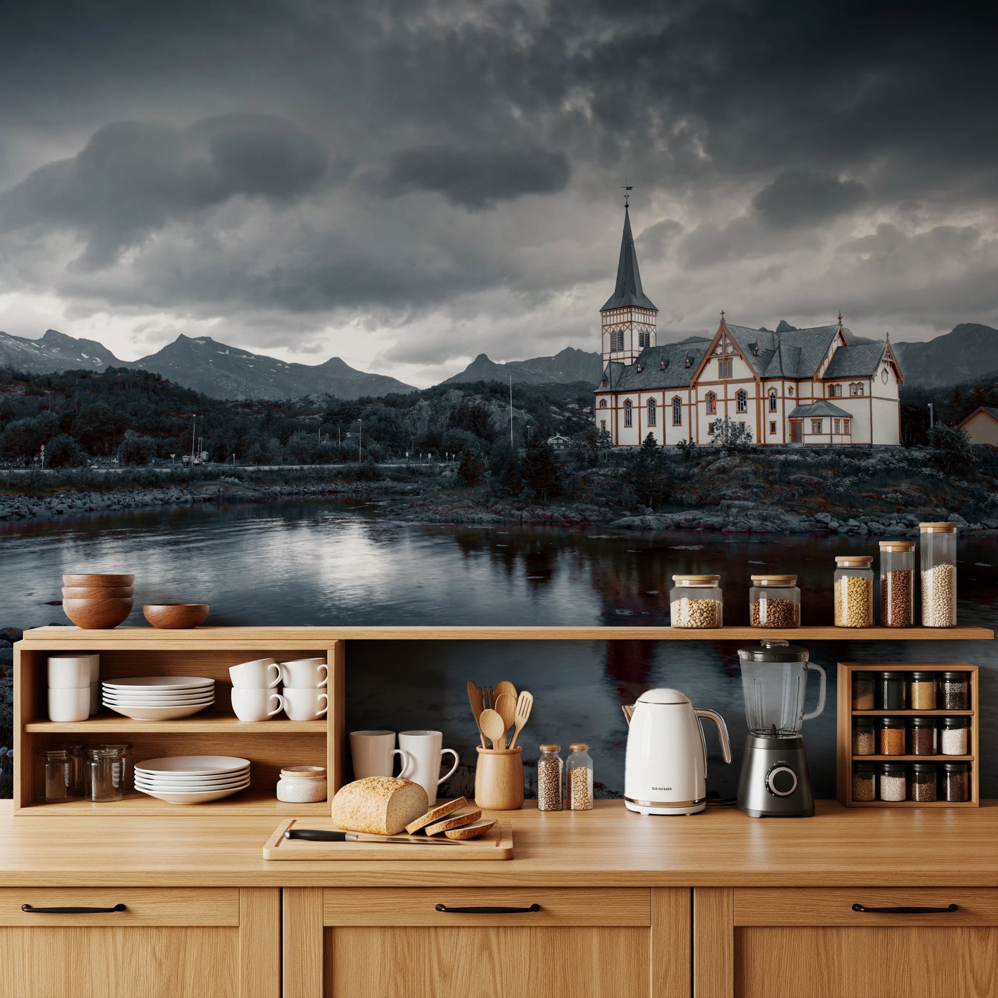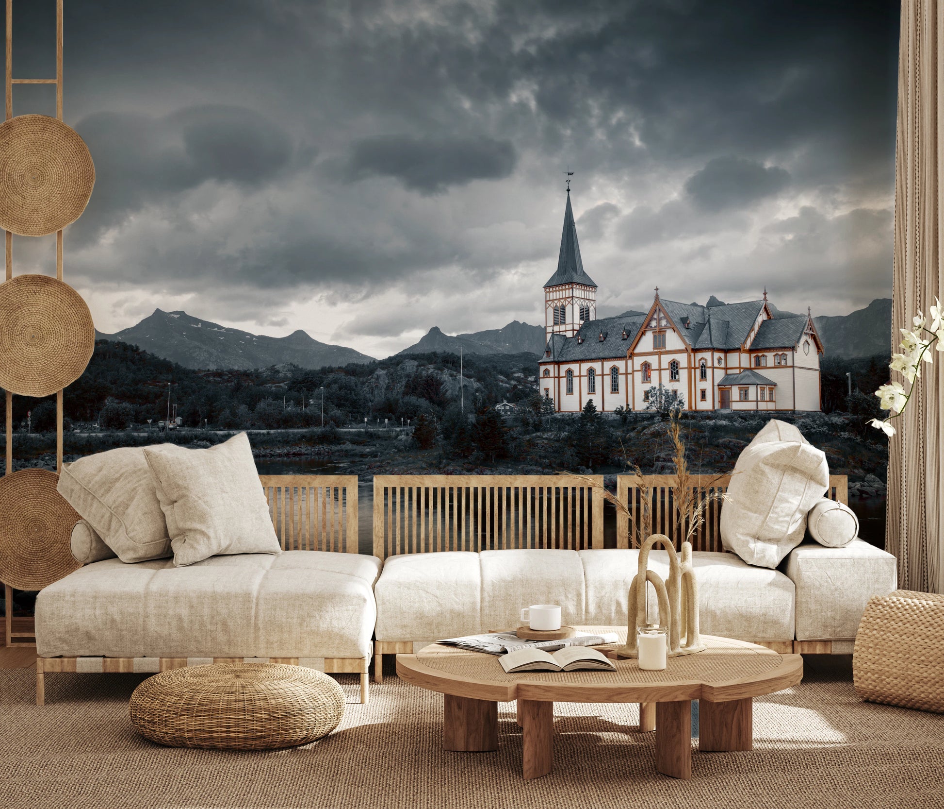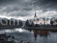 Church in Lofoten, Norway. Invite tranquility into your space with 'Sacred Shores,' a captivating piece that evokes a sense of peace and reverence. This imagery portrays a serene coastal landscape dominated by a striking church nestled amidst rugged mountains and reflective waters. The dramatic interplay of light and shadow, coupled with the muted colour palette, creates an atmosphere of quiet contemplation. The detailed architecture of the building and its reflection mirrored in the calm waters, adds to the allure, suggesting stories of faith and resilience. Embrace this exquisite scene, transforming your wall into a sanctuary of serenity and timeless beauty.