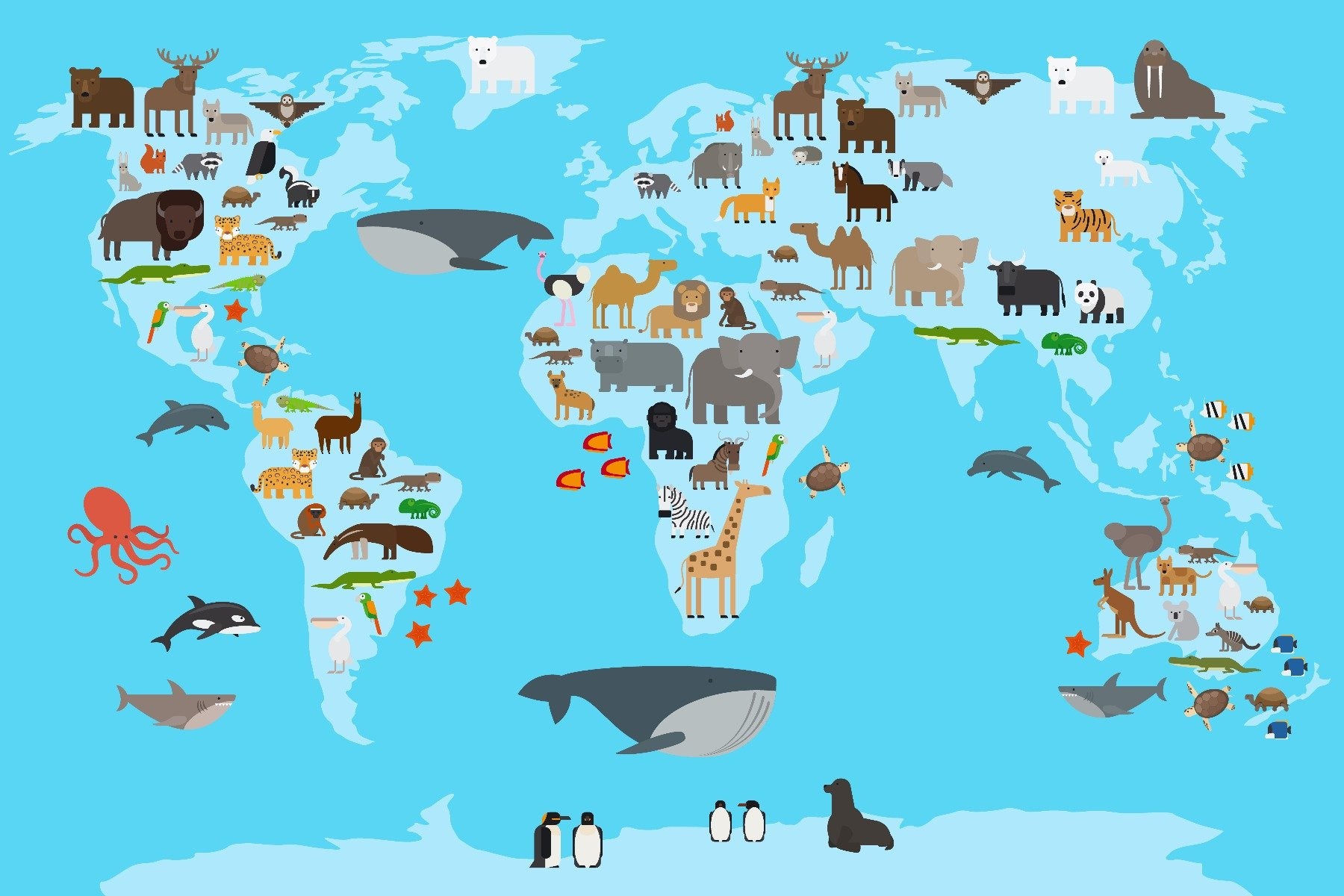 Fun animals map wallpaper mural for kids' bedroom decor.