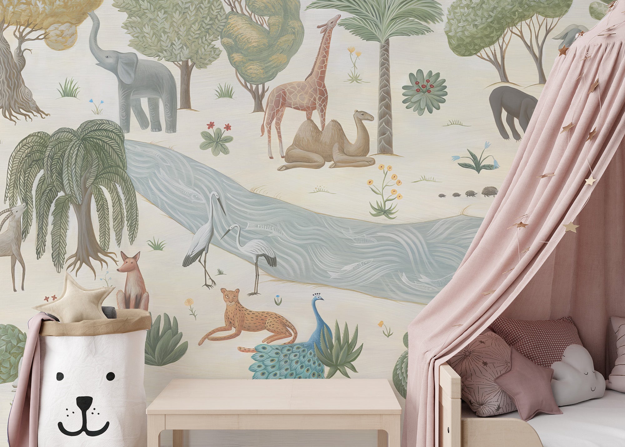 Playful safari whispers mural for kids’ rooms