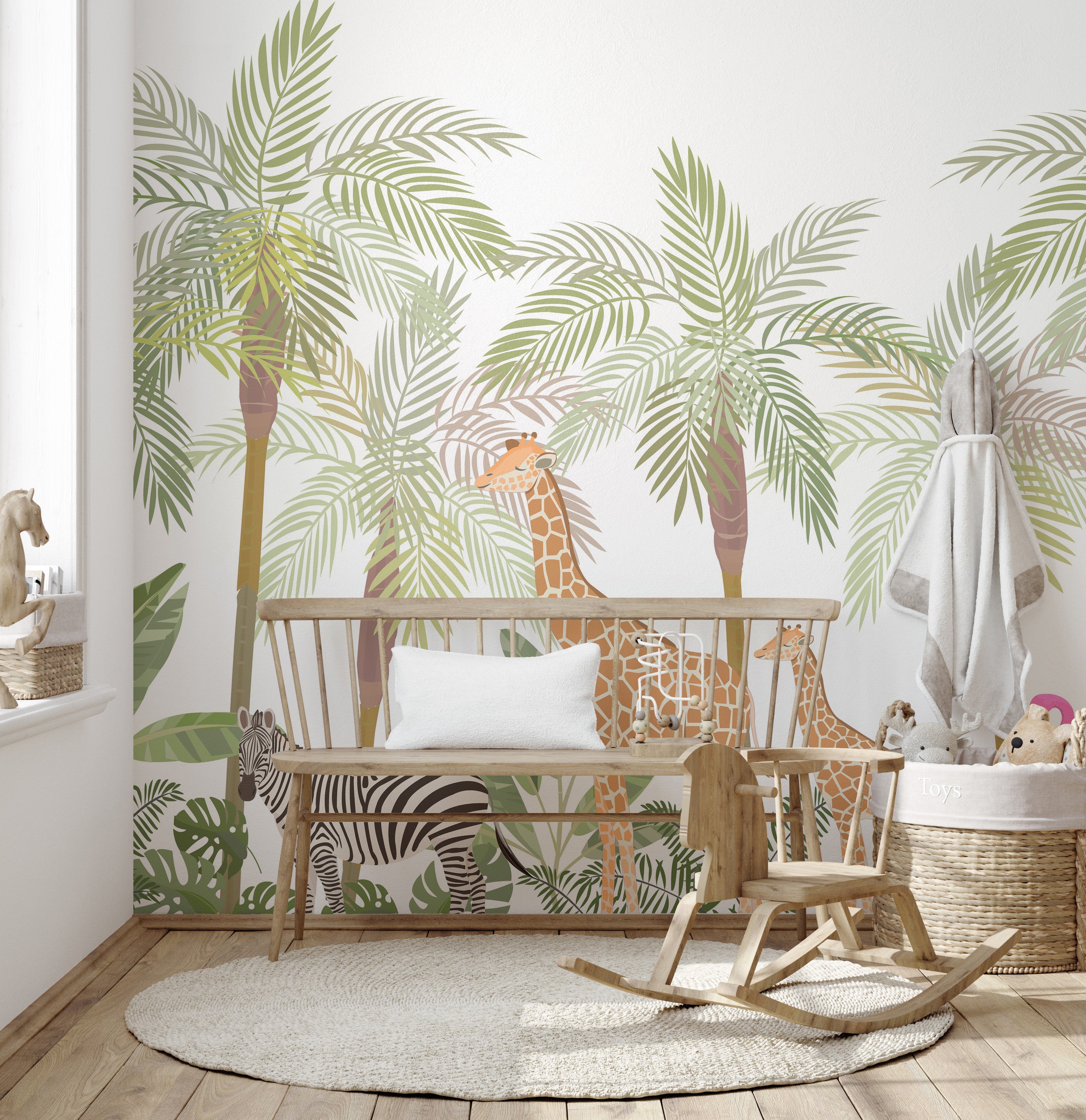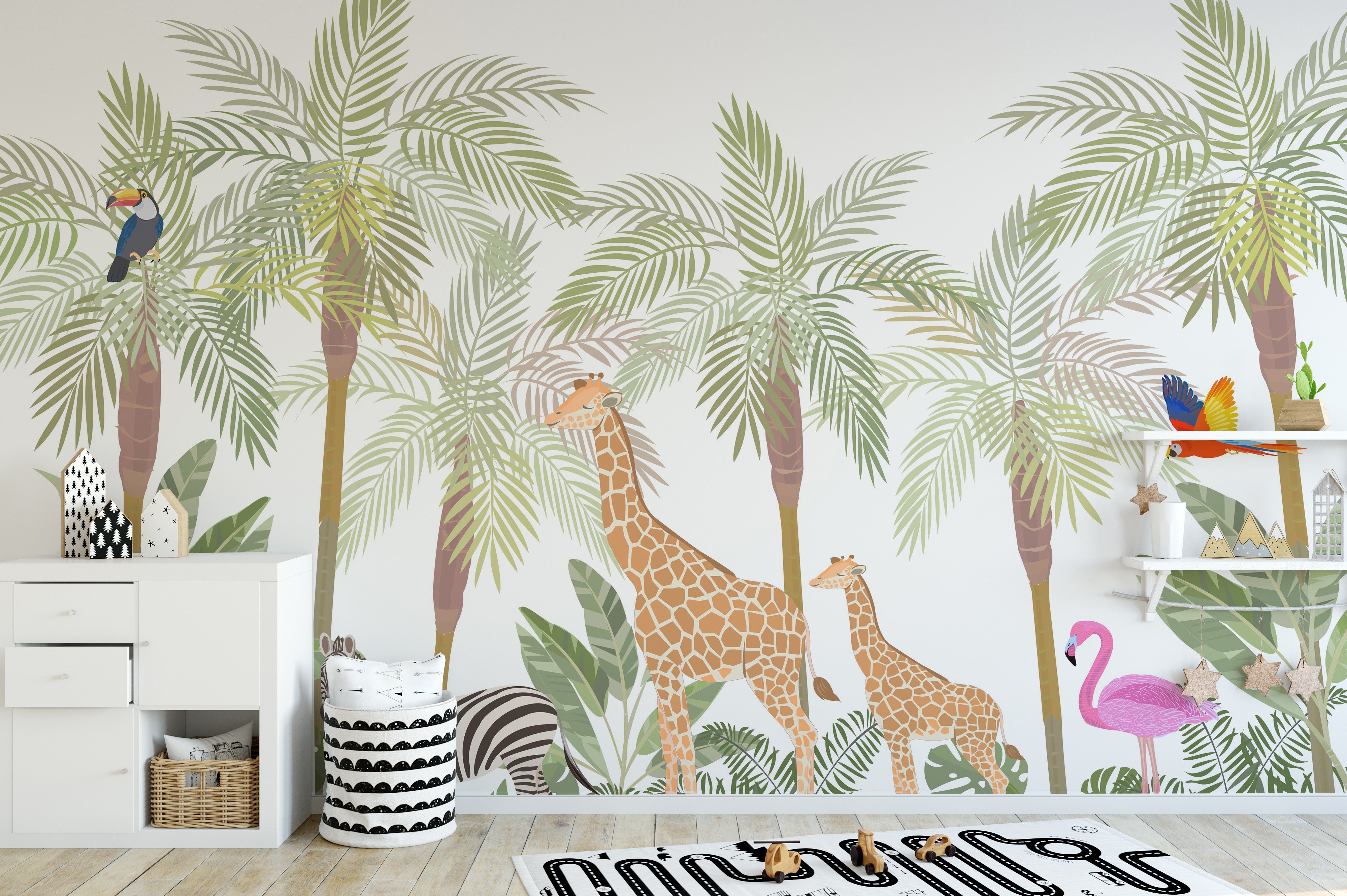Elevate a child's play area with this safari wild cartoon animals tropical mural wallpaper, a perfect addition for creating an engaging playroom environment. This kids wallpaper boasts a lively design filled with cartoon representations of safari animals, such as zebras, lions, and toucans, all set in a vibrant, tropical setting. The colourful and playful imagery is ideal for stimulating a child's imagination and fostering a sense of adventure. Crafted from durable materials, it's designed to withstand the hustle and bustle of playtime activities, while its easy-to-clean surface simplifies upkeep. This mural wallpaper is excellent for parents and caregivers looking to cultivate a cheerful and harmonious play area. Its dynamic and inviting design beautifies the space and serves as a backdrop for endless stories and playtime explorations, making it a beloved feature in any playroom.