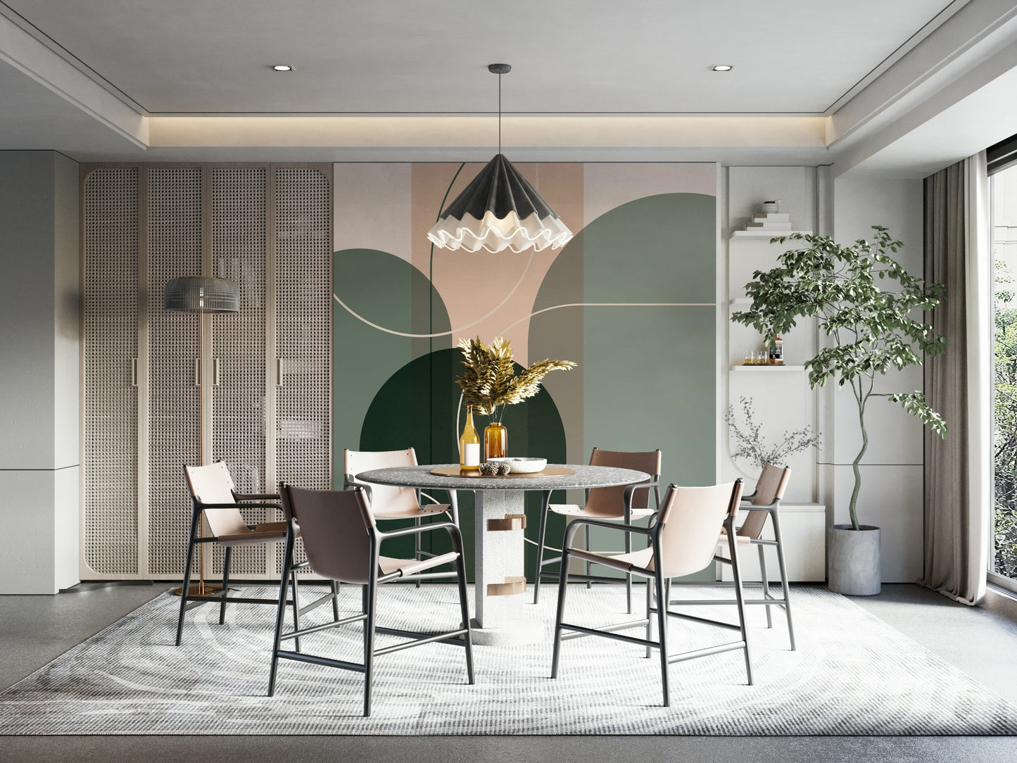 Escape to a tranquil oasis with this captivating wallpaper. The design features a harmonious blend of peach and shades of sage green, creating a calming and sophisticated atmosphere. Overlapping, rounded geometric shapes form a visually interesting pattern, while clean lines and a minimalist approach maintain a sense of understated elegance. This versatile wallpaper is perfect for adding a touch of serenity and modern style to bedrooms, living rooms, or even home offices. The soft, muted colors promote relaxation and create a peaceful space.