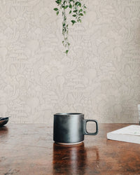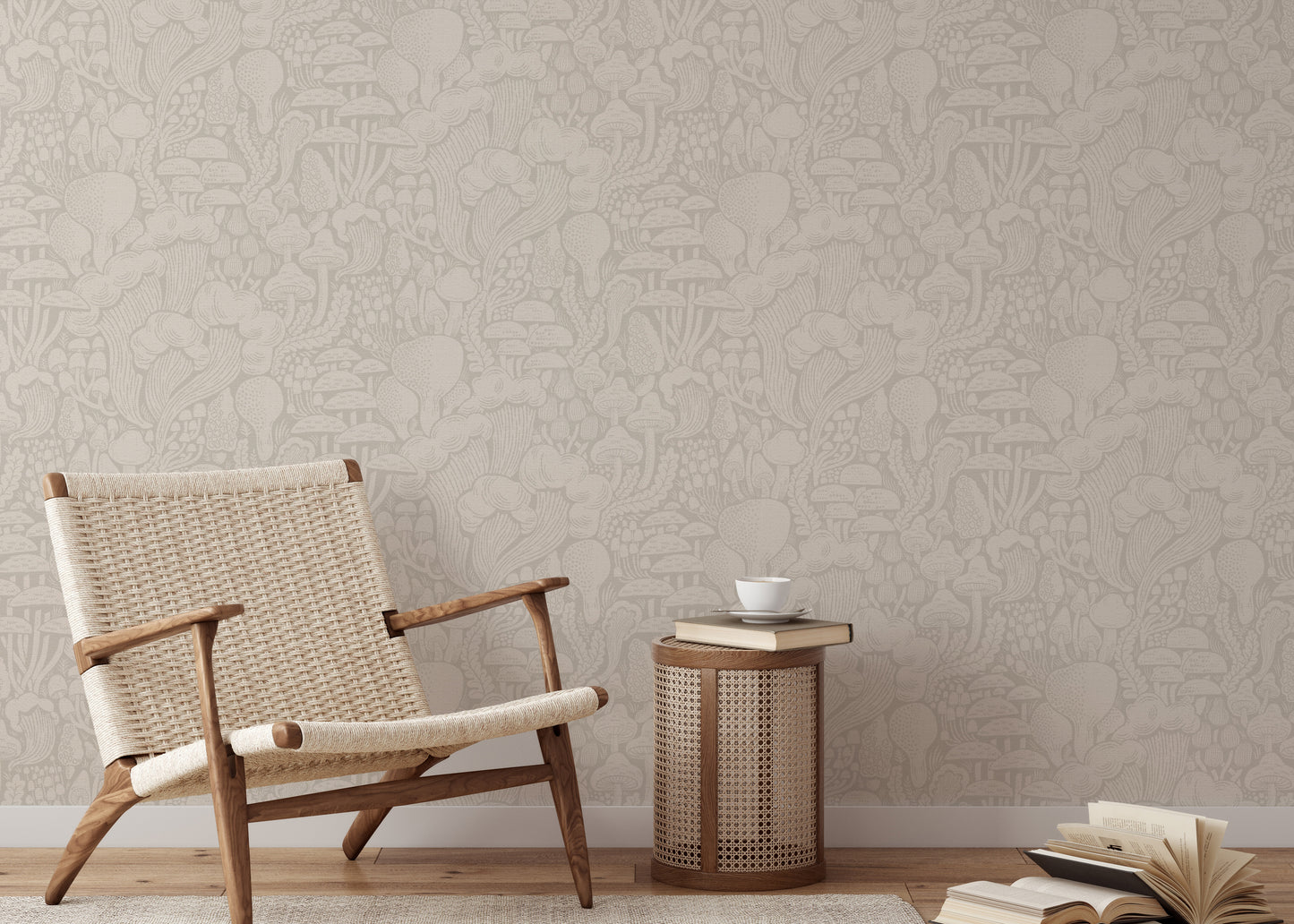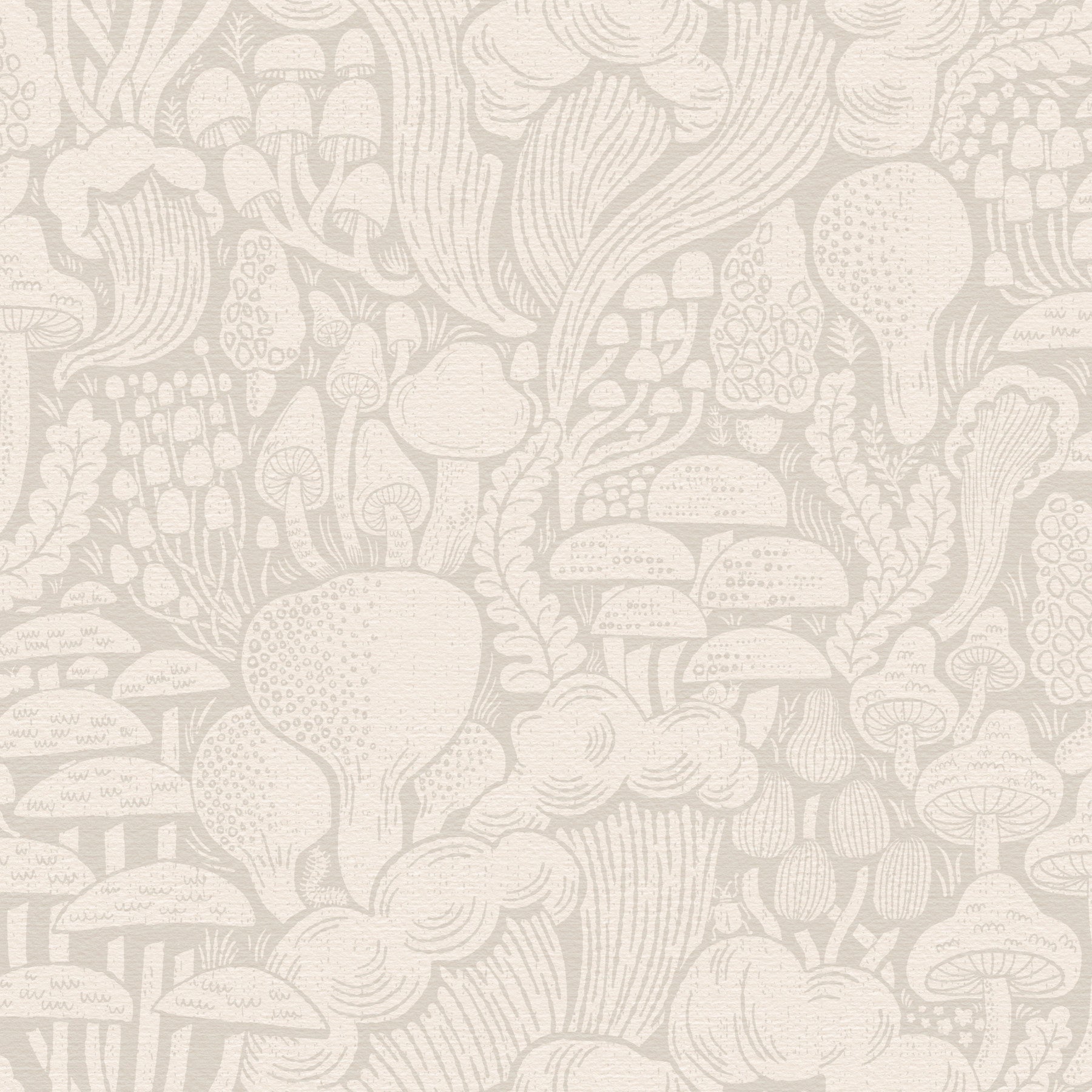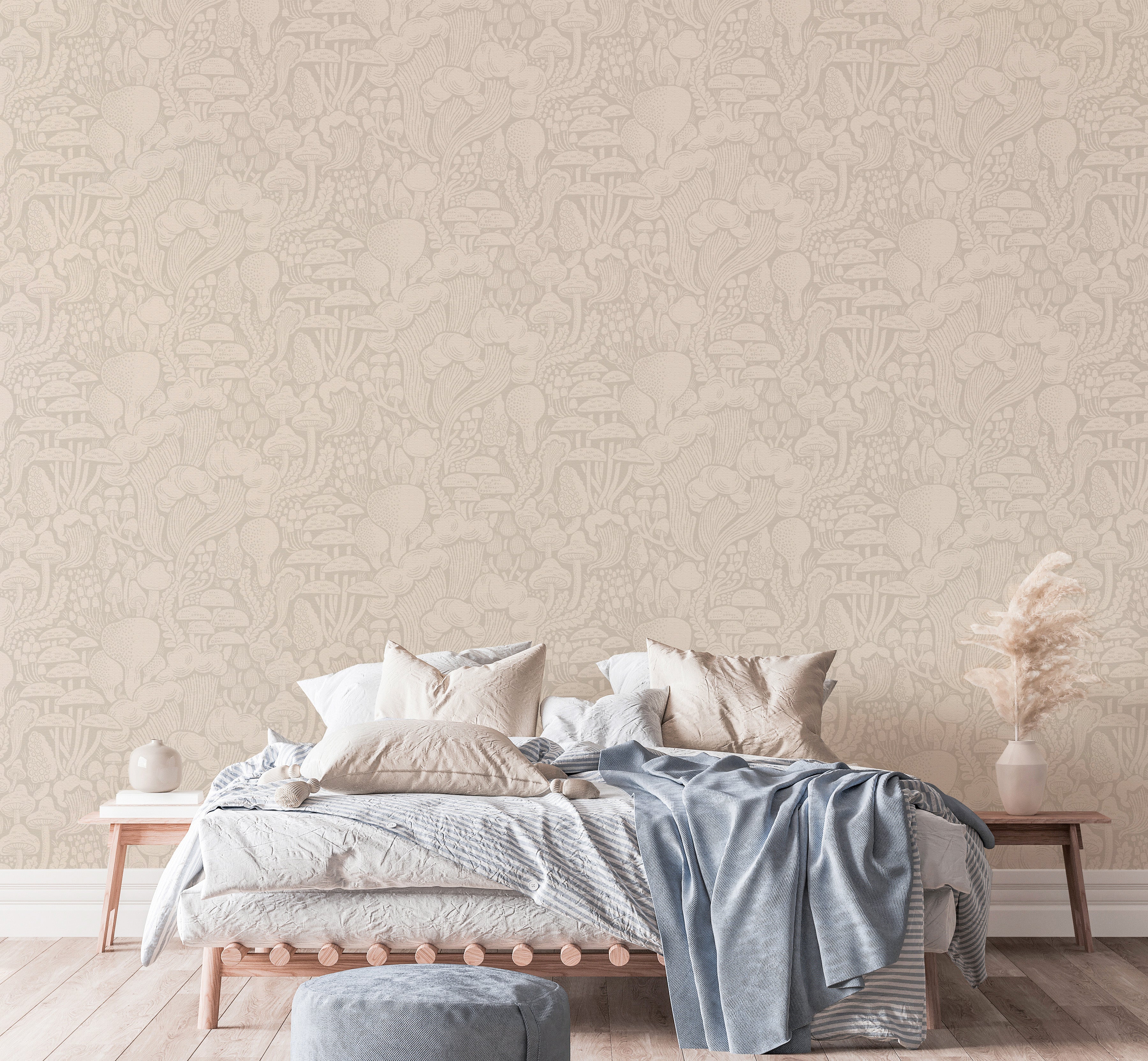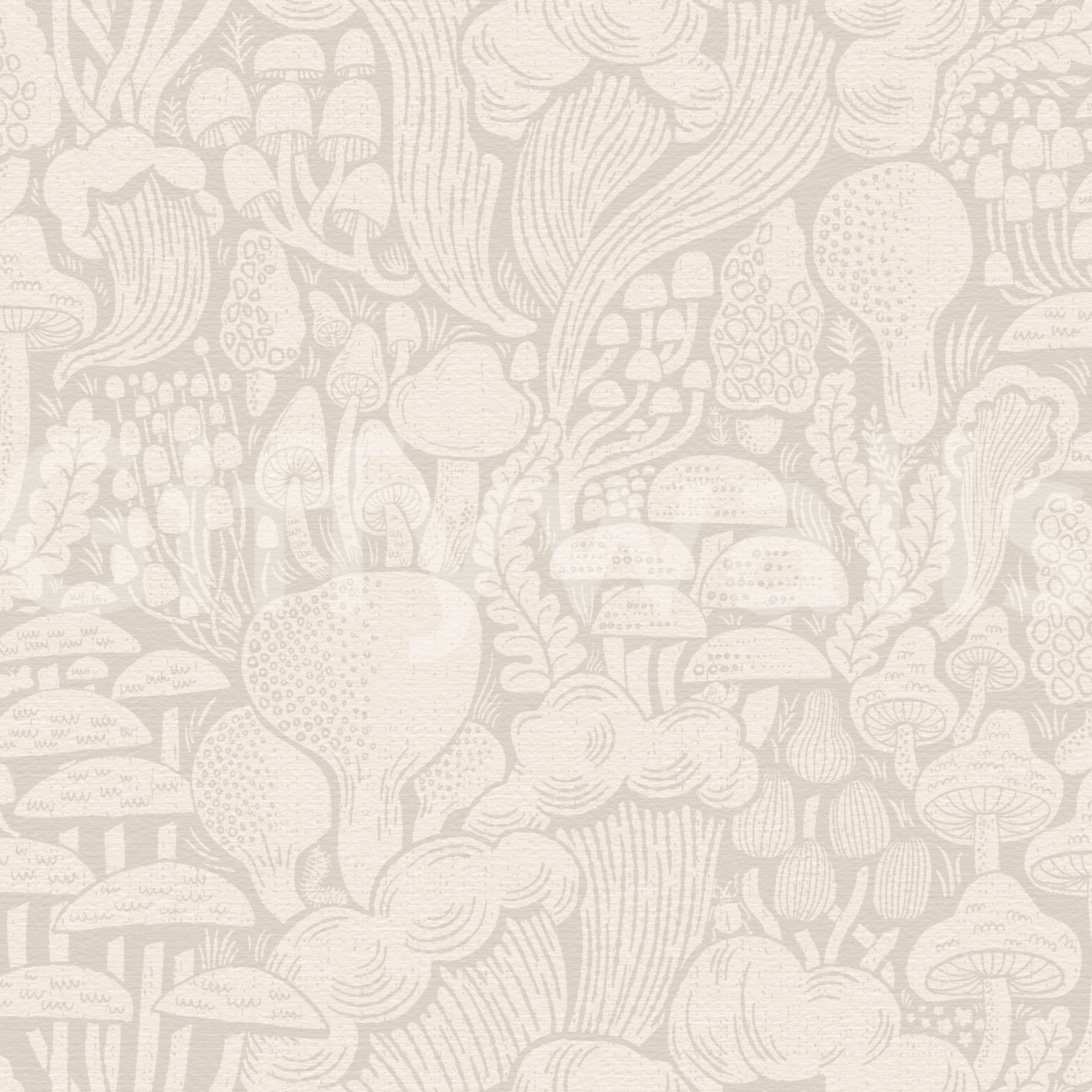 Bathe your screen in the ethereal beauty of 'Sand Fungi Forest Silhouettes.' This wallpaper presents a captivating tapestry of stylized mushroom forms, rendered in delicate off-white silhouettes against a textured beige background, reminiscent of sun-baked sand. Various mushroom types, from slender toadstools to broad-capped fungi, create a dense, enchanting forest scene. The subtle texture adds depth, enhancing the organic feel and inviting a sense of calm and wonder. Perfect for those seeking a minimalist yet magical digital escape.