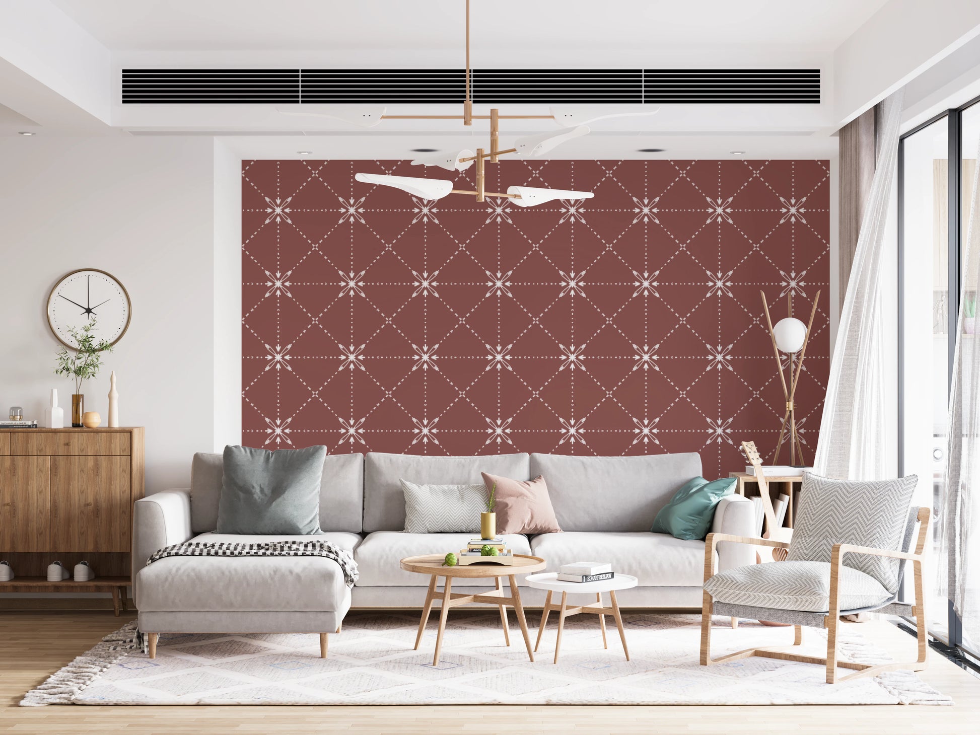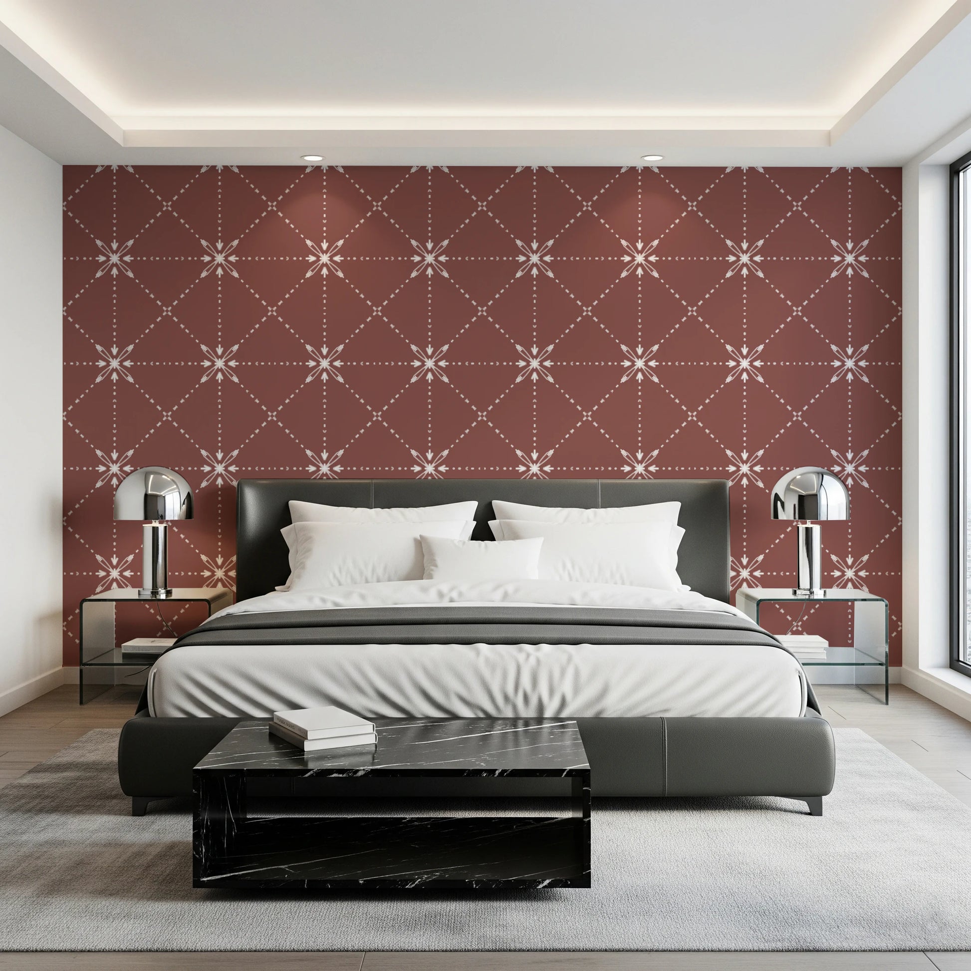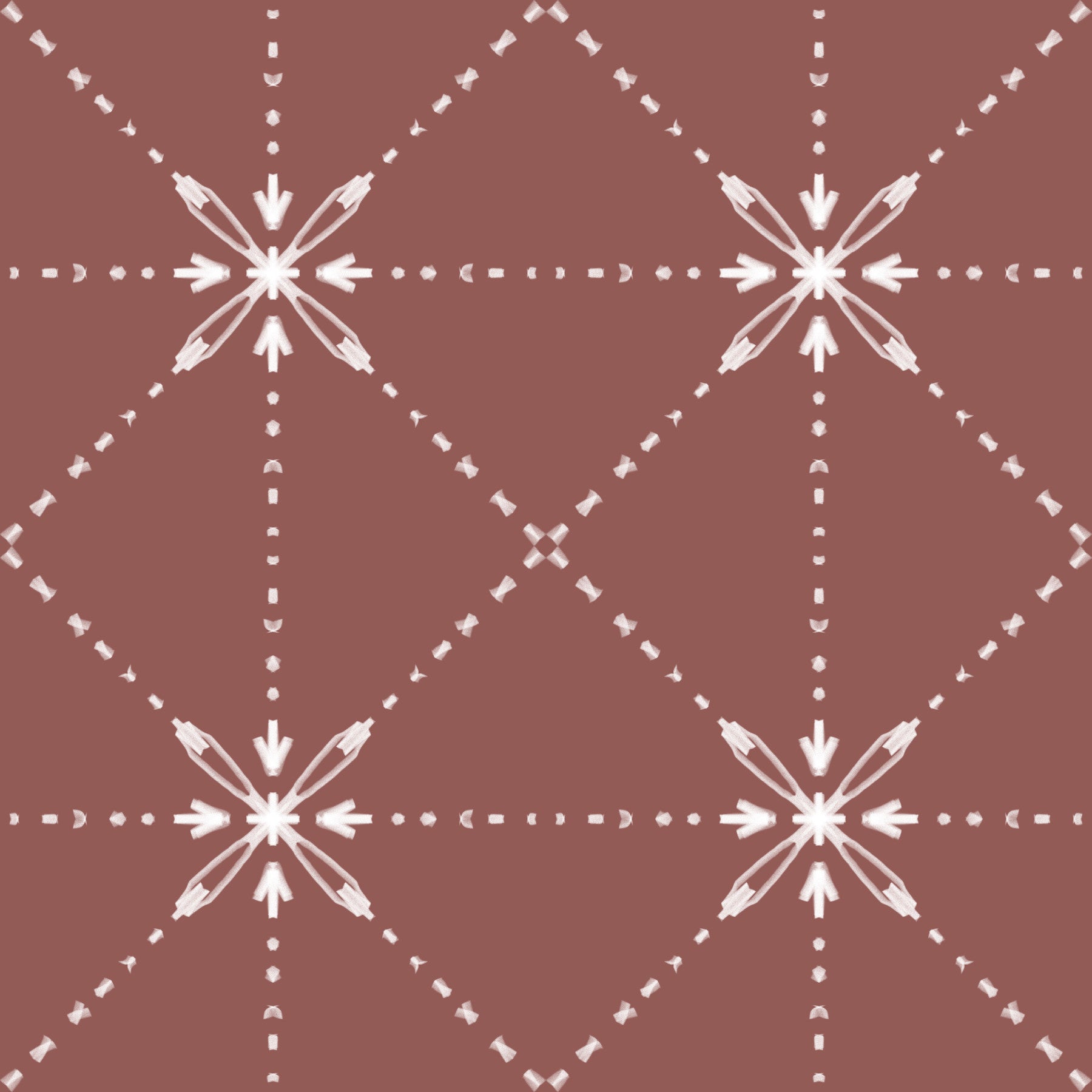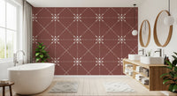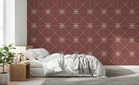 Evoke the warmth of sun-baked earth with 'Sashiko Hana-Goshi'. This design reimagines the ancient Japanese embroidery technique of Sashiko, featuring a delicate latticed flower stitch pattern against a rich terracotta backdrop. The subtle, textured lines create an impression of hand-stitched artistry, offering depth and visual interest. Each 'Hana-Goshi,' or flower motif, is interconnected by dotted lines, bringing a sense of rhythmic movement and understated elegance. This pattern adds a touch of rustic sophistication to any room, harmonising tradition with modern sensibilities. Perfect for adding a touch of warmth and subtle texture to your walls.