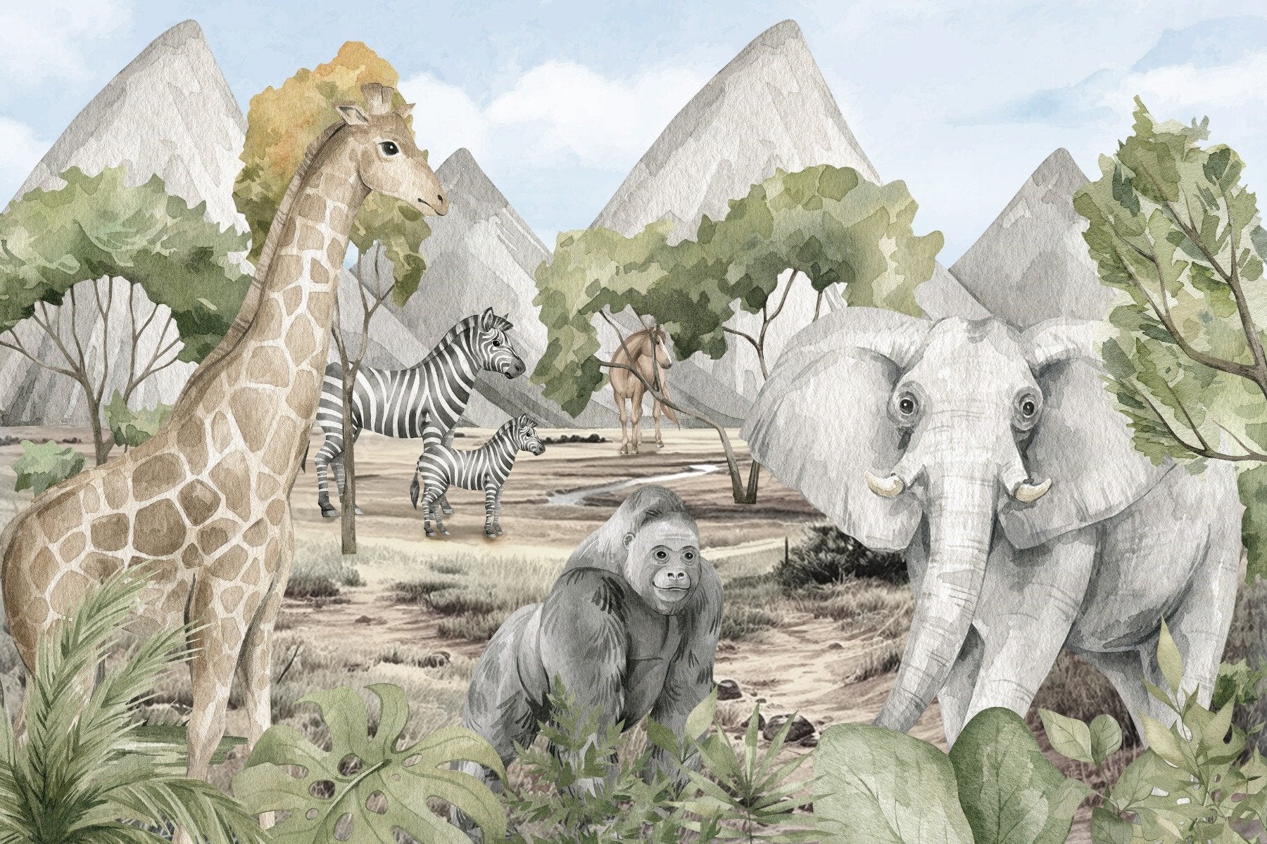 Step into the wild with the Savannah Serenity Wildlife Wall Mural, where the untamed heart of the jungle comes to life. This exquisite wildlife wallpaper is a rich tapestry of Africa's most majestic creatures, from towering giraffes to mighty elephants, each rendered with stunning detail. Ideal for anyone looking to embrace the spirit of adventure, this mural brings the essence of the savannah right into your home. It's more than just animal wallpaper it's a silent storyteller, a slice of the jungle that whispers tales of nature's wonders. With its soothing palette and lifelike scenes, it captivates and enchants, turning any room into a serene safari escape.