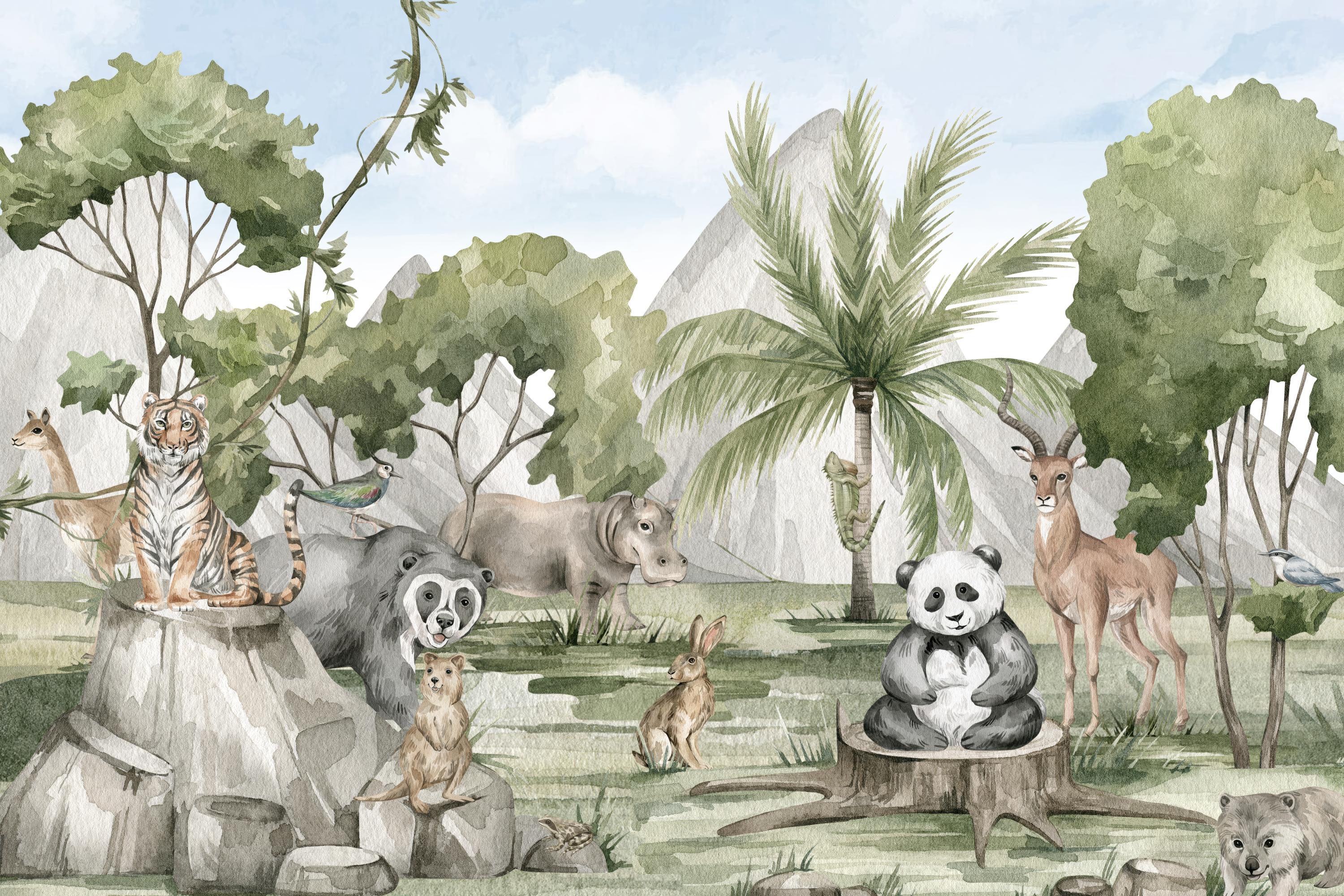 Imagine a kids room where every day is a journey through the Savannah Summit, a place where wildlife greets you with its majesty and charm. Our meticulously designed mural wallpaper is a portal to this world, offering a full spectrum of animals in their natural habitat. It's not merely a visual treat, it's an interactive piece that invites children to learn about lions, giraffes, and elephants. They can trace the stripes of a zebra or the flight of a bird, all from the cozy confines of their room. This kids room wallpaper serves as a continuous source of inspiration, kindling curiosity, and the urge to explore.