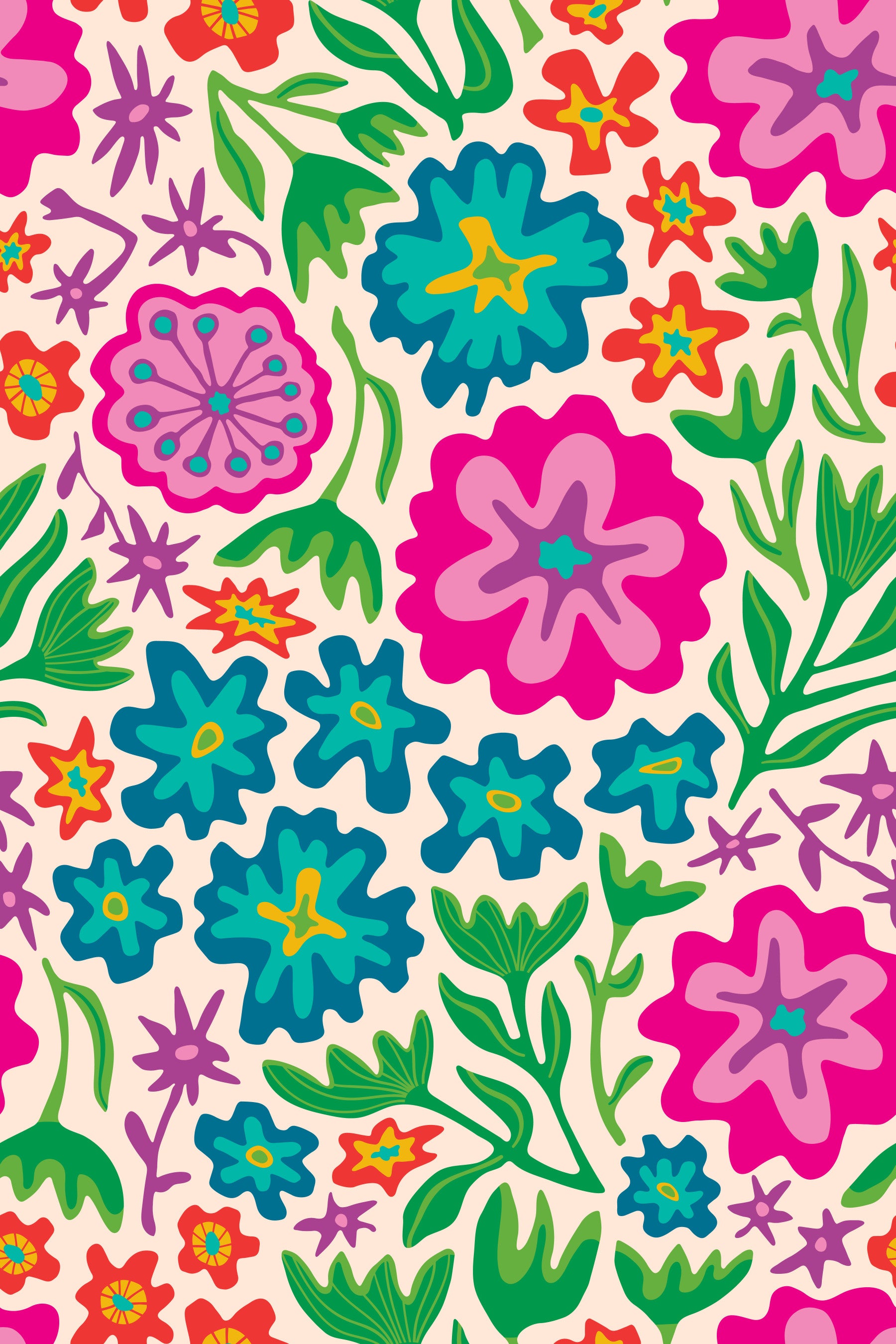 Infuse your walls with the free-spirited vibes of the Mexican surf town of Sayulita, where colour reigns supreme and every day feels like a fiesta! Immerse yourself in the playful energy of flowers and leaves influenced by Mexican folk art, reimagined for the modern home. This design bursts with bold botanical life, featuring stylised florals and lush foliage in a kaleidoscope of rainbow brights: hot pink, turquoise, coral, kelly green, purple, yellow and bright blue, all dancing against a light fresh cream background that adds depth, sophistication and "pop". The abstract style evokes a sense of carefree artistry and authentic charm, reminiscent of traditional Mexican crafts. This pattern design is also available in Other Colourways too! Original wallpaper pattern design by Jackie Tahara of UnBlink Studio.