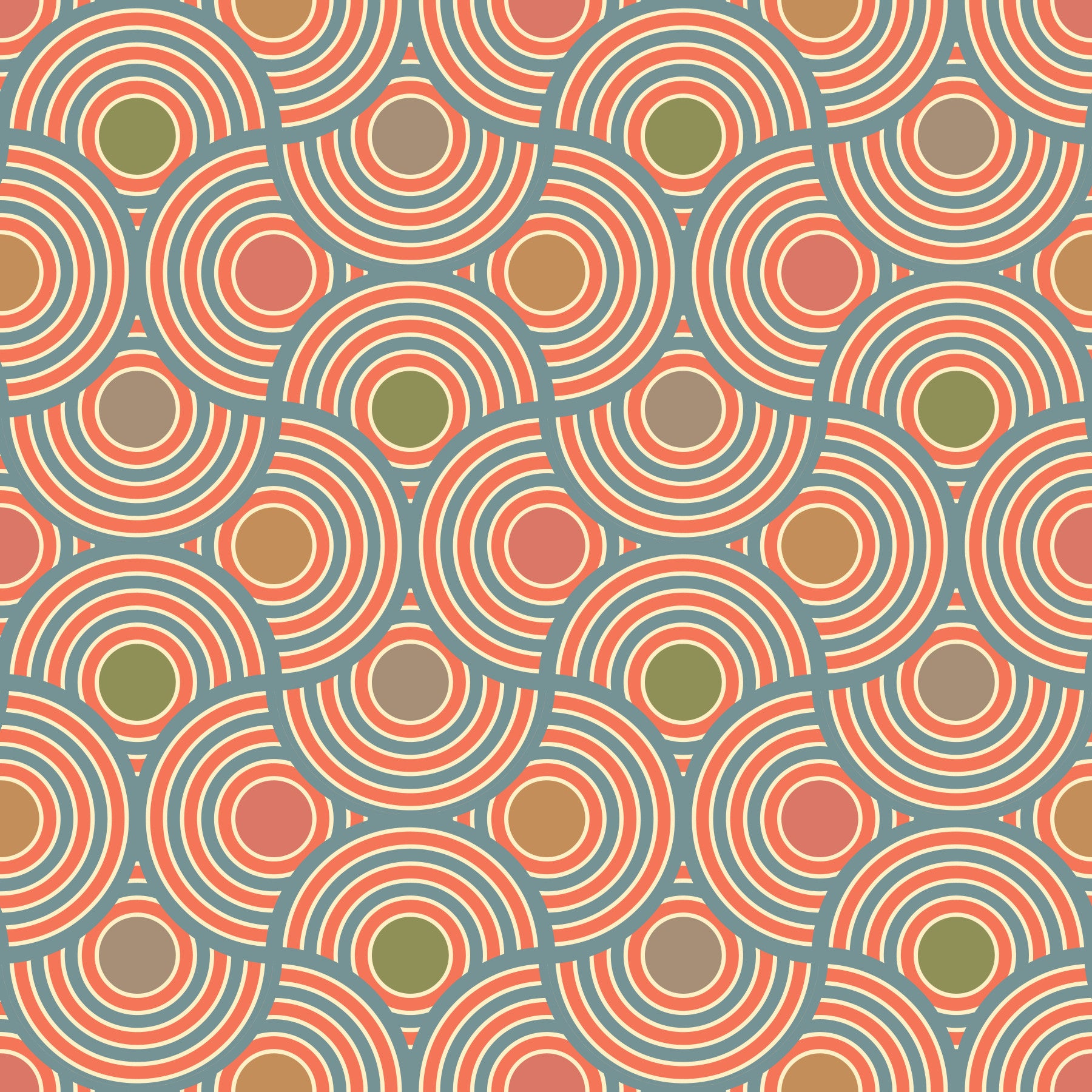 Evoke a retro-chic ambiance with this captivating Scallop wallpaper that vibrantly fuses vintage geometric Art Deco style with an elegant color palette. This abstract pattern of round circular rainbow motifs in a structured geometric layout is visually dynamic and captivating. The color palette is a delightful blend of warm colors, including powder blue, olive green, red, brown and beige which come together to create an elegant vintage atmosphere. Perfect for adding a touch of sophisticated nostalgia and playful energy to any space, this wallpaper is sure to transform your walls into a stunning statement piece. Embrace the beauty of bygone eras with a contemporary twist. This pattern design is also available in Other Colourways too! Original wallpaper pattern design by Jackie Tahara of UnBlink Studio.