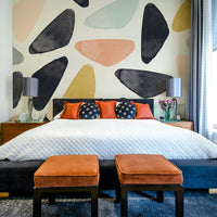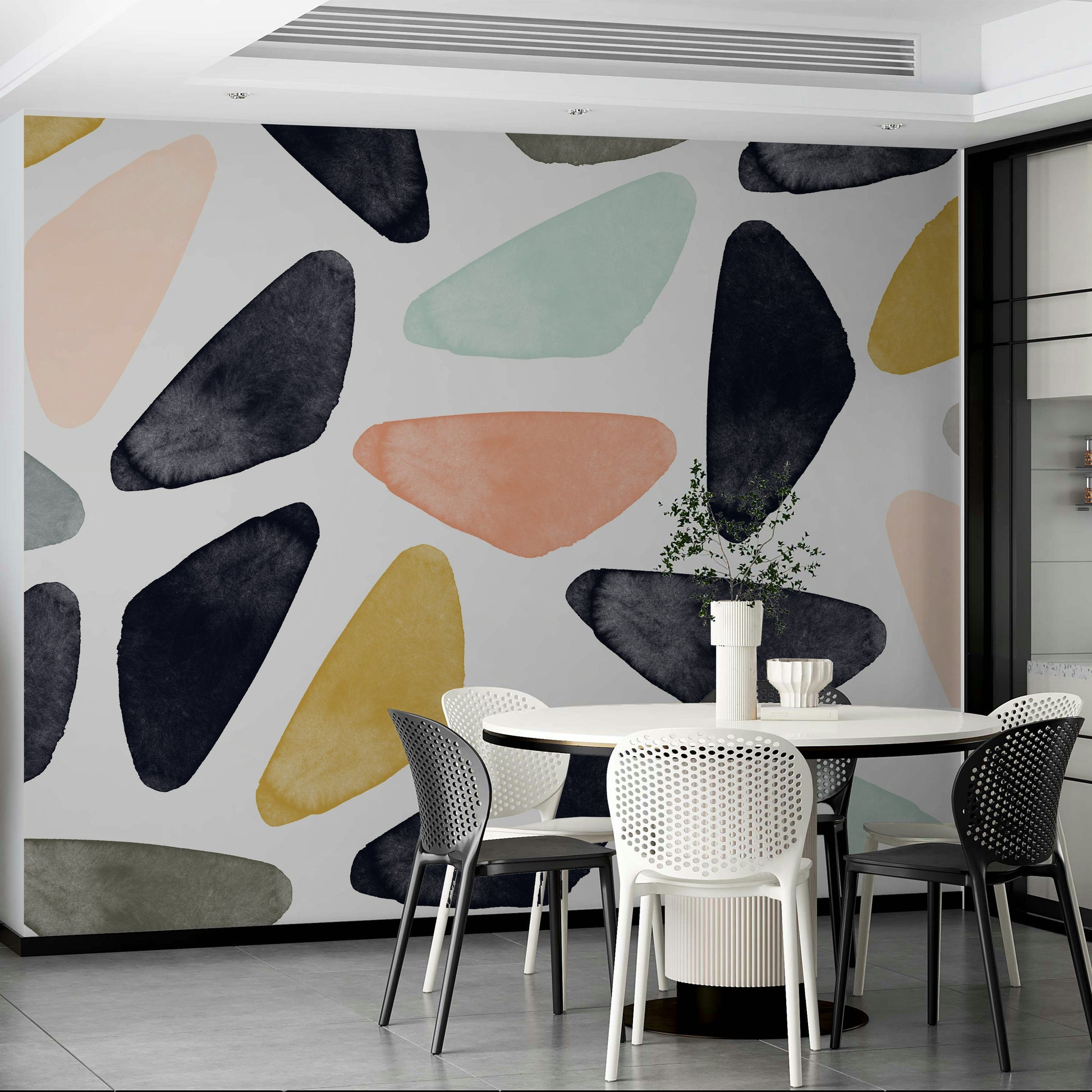 Embrace minimalist serenity with this Scandinavian-inspired wallpaper. Soft, muted tones of blush pink, sage green, and dusty grey are playfully contrasted with deep navy and golden mustard accents. The organic, free-flowing shapes evoke a sense of calm and natural beauty, reminiscent of smooth, water-worn stones. This abstract design perfectly captures the essence of Scandinavian design: simple elegance and understated sophistication, creating a tranquil and stylish atmosphere for any digital device.