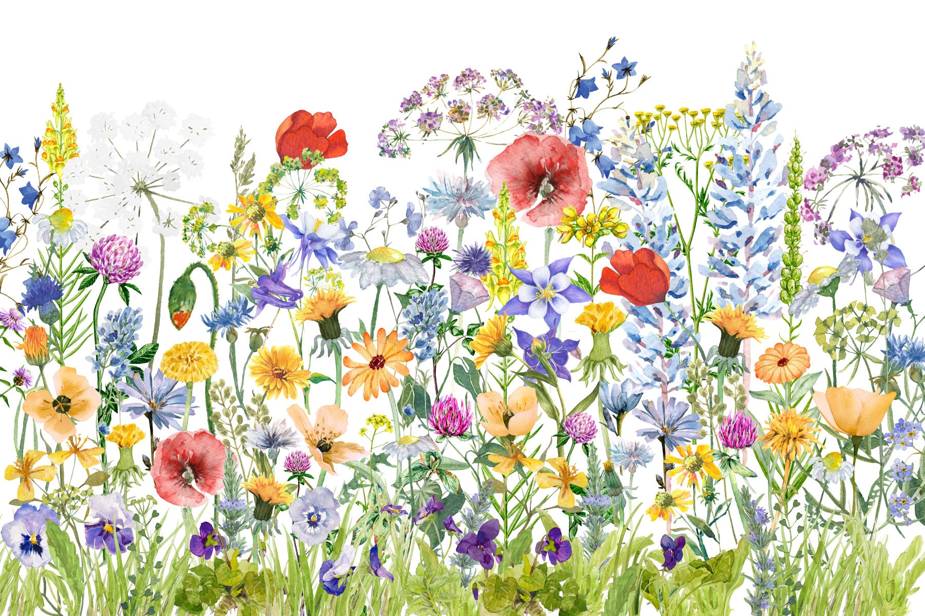 Scandinavian Watercolor Meadow Poppies with Colorful Wildflowers Wall Mural