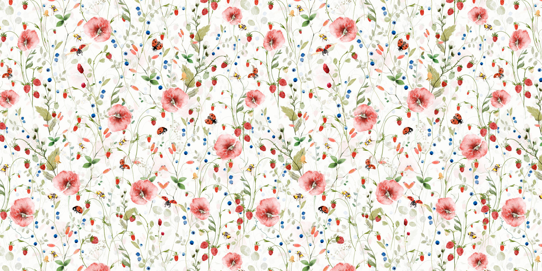 This playful Scandinavian watercolor artwork features delicate poppies, strawberries, blueberries, and wild berries, accented with ladybugs and bees for a lively natural touch. The airy white background enhances the bright red and blue details, creating a joyful atmosphere full of freshness. Perfect for nurseries, kidsrooms, and interiors that embrace whimsical nature and botanical charm, this design blends modern Scandinavian lightness with vintage inspiration. A versatile choice for bright and happy home decor. Created by Uta Naumann.
