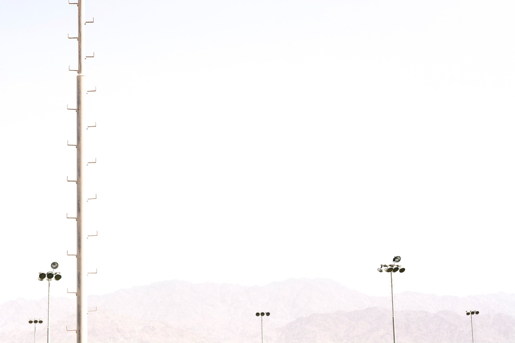Eilat #32 captures the stark beauty of the desert landscape with a minimalist aesthetic. Towering light fixtures, their function subtly implied, punctuate the expansive white sky, creating a sense of scale and isolation. The faint, almost ethereal silhouette of the mountains forms a distant backdrop, adding depth and perspective to the otherwise sparse composition. This image evokes a feeling of quiet contemplation, inviting the viewer to pause and appreciate the subtle textures and muted tones of the desert environment. The image's unique perspective and stark contrast make it an ideal wallpaper for those seeking a clean, modern, and subtly evocative aesthetic for their digital devices. It provides a calming, uncluttered backdrop, allowing icons and widgets to remain easily visible.