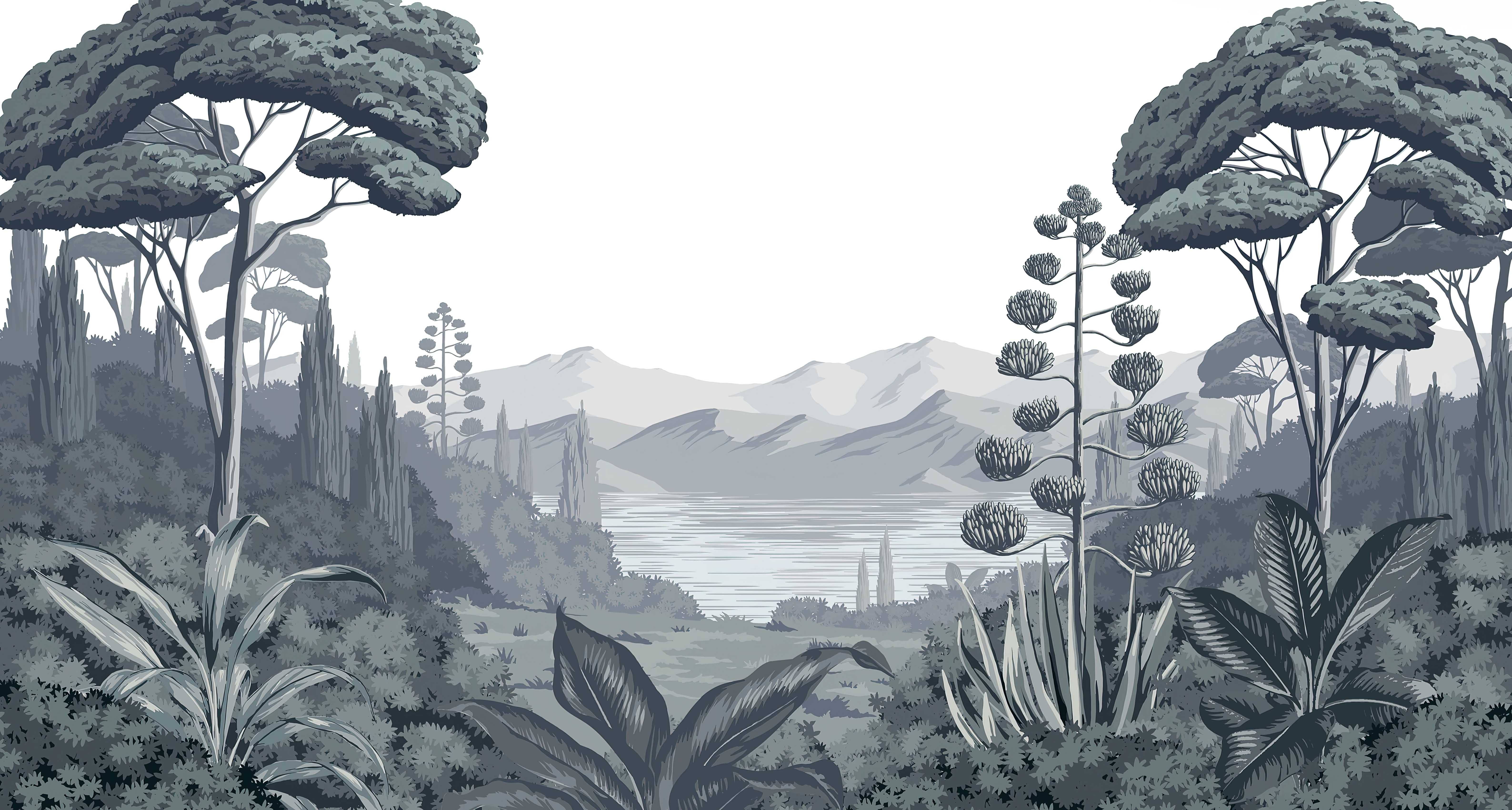 Incorporate the beauty of nature inside with the Scenic Botanical Landscape Wall Mural. This scenic landscape mural features lush vegetation, grand trees, and a water scenic wallpaper of a calm mountain lake, providing a tranquil retreat. The botanical plant wallpaper combines traditional elegance with contemporary style, suitable for decorating the living room, bedroom, or office. Its grayscale tropical wallpaper pattern brings dimension and elegance, and the dramatic floral mural provides any space with a tranquil atmosphere. Upgrade your designs with this stylish artistic landscape wallpaper, and it will give life to your wall into an incredible natural paradise.