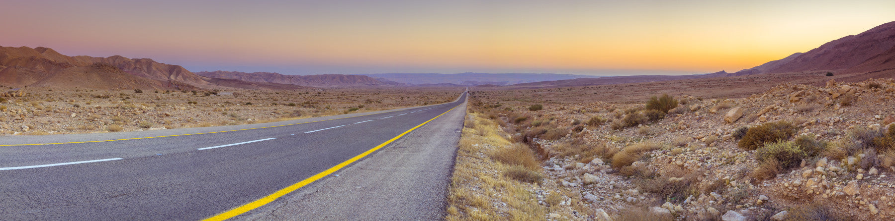Highway through desert, Israel. Embark on a visual journey with this stunning wallpaper, capturing the serene beauty of a desert highway as twilight paints the sky. The long, asphalt road stretches into the distance, flanked by rocky terrain and low scrub, all bathed in warm hues of orange, pink, and purple. This landscape wallpaper brings a sense of adventure and tranquility to any room, evoking the spirit of the open road and the vastness of the desert. Perfect for creating a calming yet inspiring atmosphere, ideal for spaces where you seek reflection and wanderlust.
