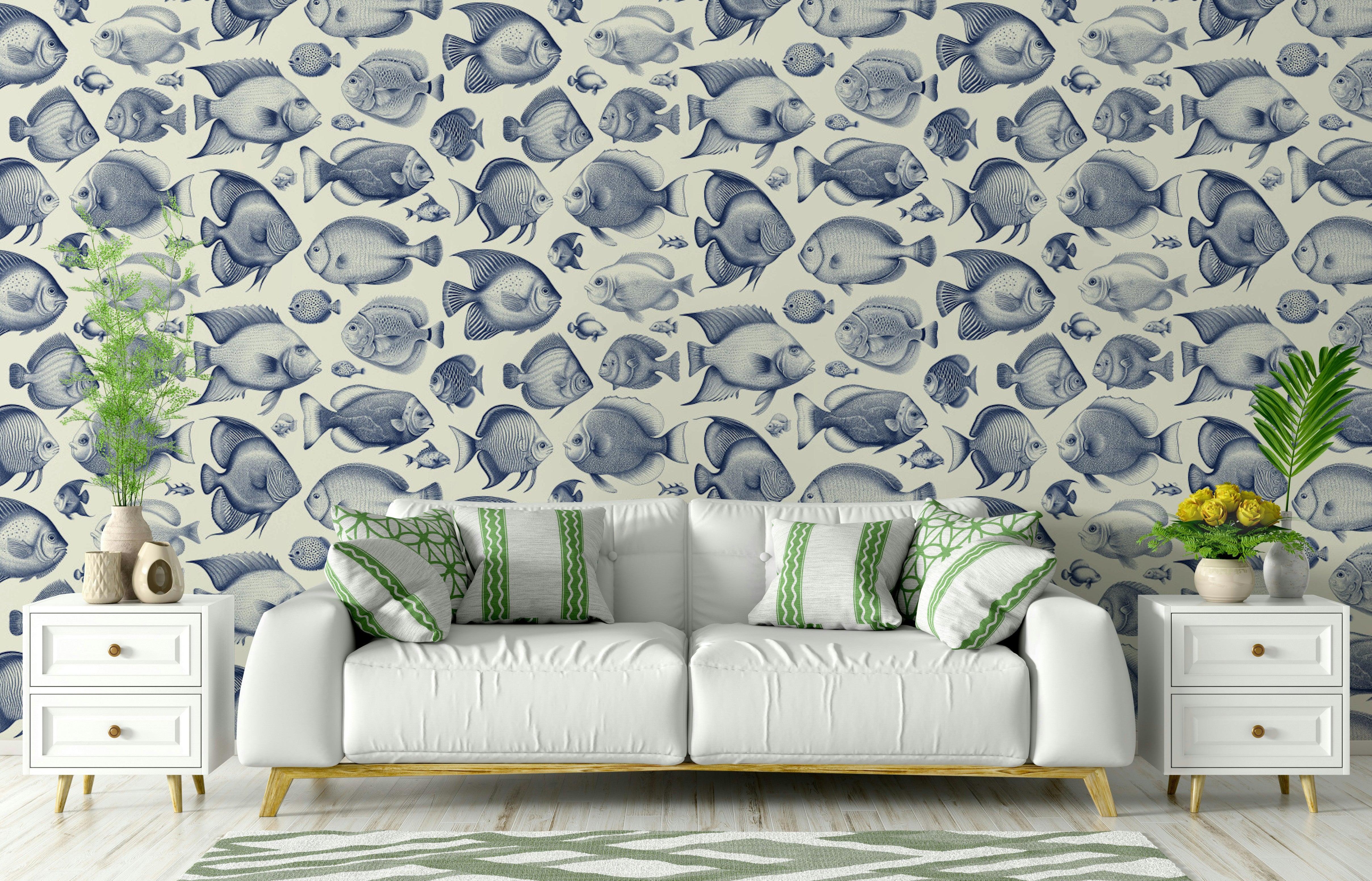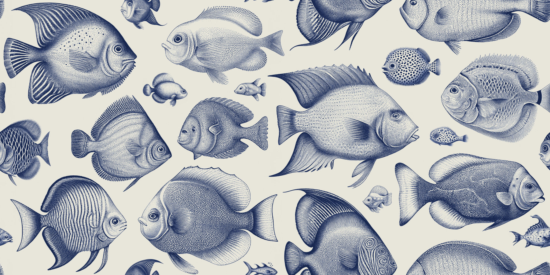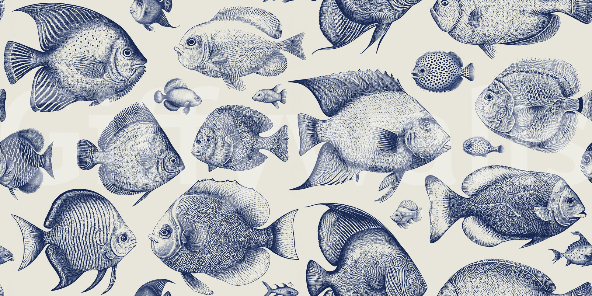 Exotic fish drawn in Delft blue over soft cream backdrop