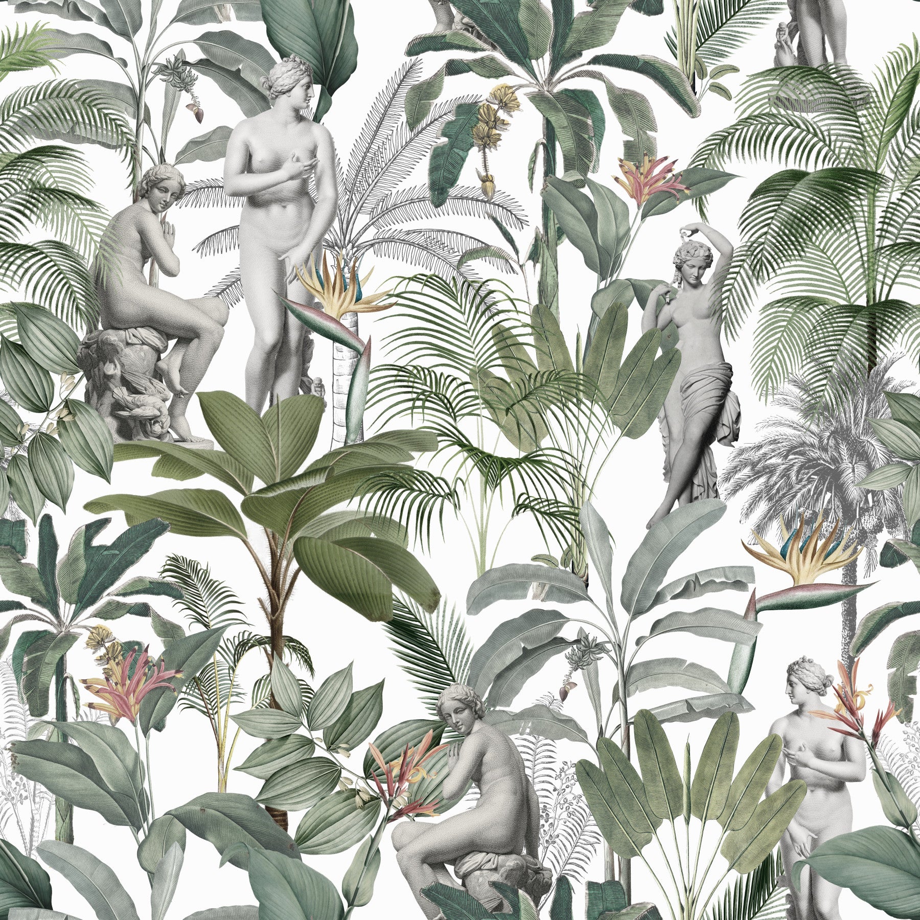 Escape to a world of exquisite artistry with 'Sculptural Tropics.' This wallpaper design is a captivating fusion of classical sculptures and vibrant tropical flora. Detailed engravings of graceful female statues are artfully arranged amidst a lush tapestry of banana leaves, palm fronds, and exotic flowers, creating a visually stunning and harmonious balance. The palette of muted greens, greys, and subtle hints of color evokes a sense of tranquility and sophistication, making it an ideal choice for adding a touch of elegance to any room. This wallpaper is a true work of art, guaranteed to transform your space.