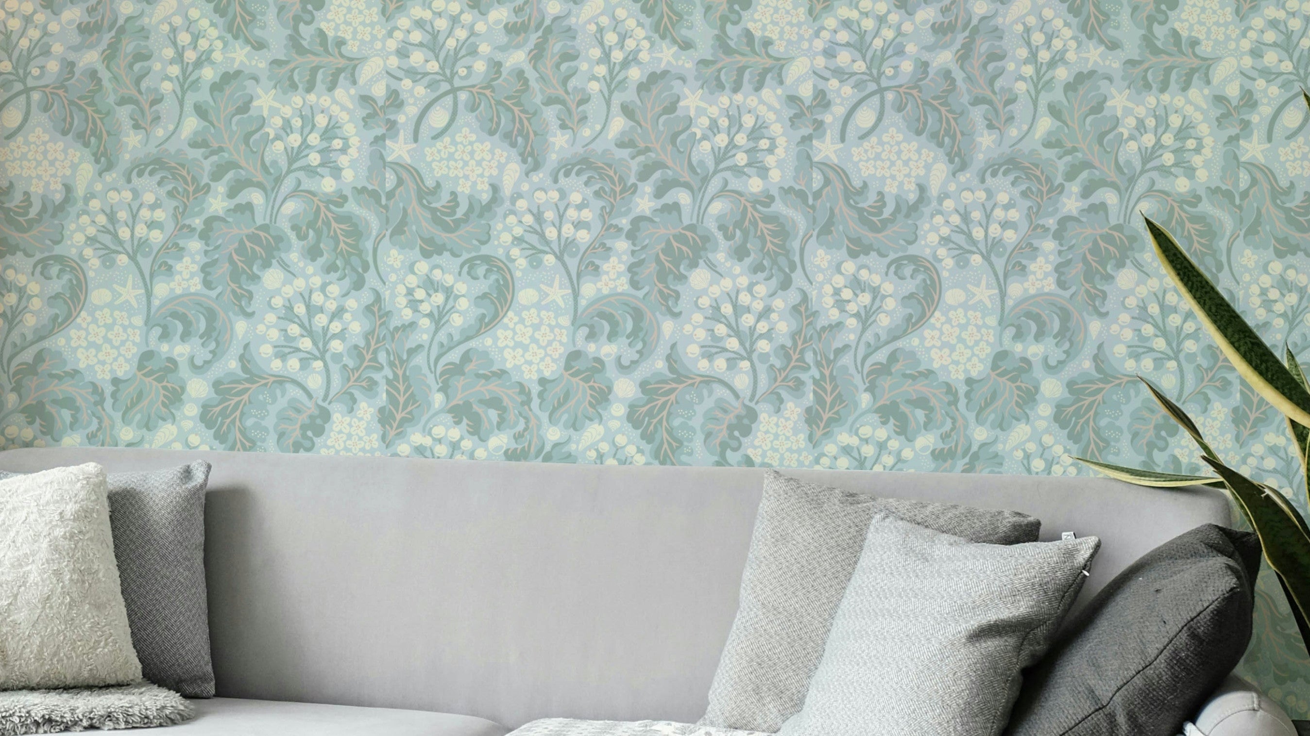 Dive into tranquility with 'Sea Kale - Baby Blue,' a serene wallpaper design. Delicate, stylized sea kale in calming shades of baby blue and creamy beige intertwine with whimsical seashells and starfish. The pattern evokes a peaceful underwater garden, where soft floral motifs dance amongst the ocean's treasures. This wallpaper creates a soothing atmosphere, perfect for bedrooms, bathrooms, or any space needing a touch of coastal charm and understated elegance. The gentle color palette and organic shapes promote relaxation and a sense of calm.