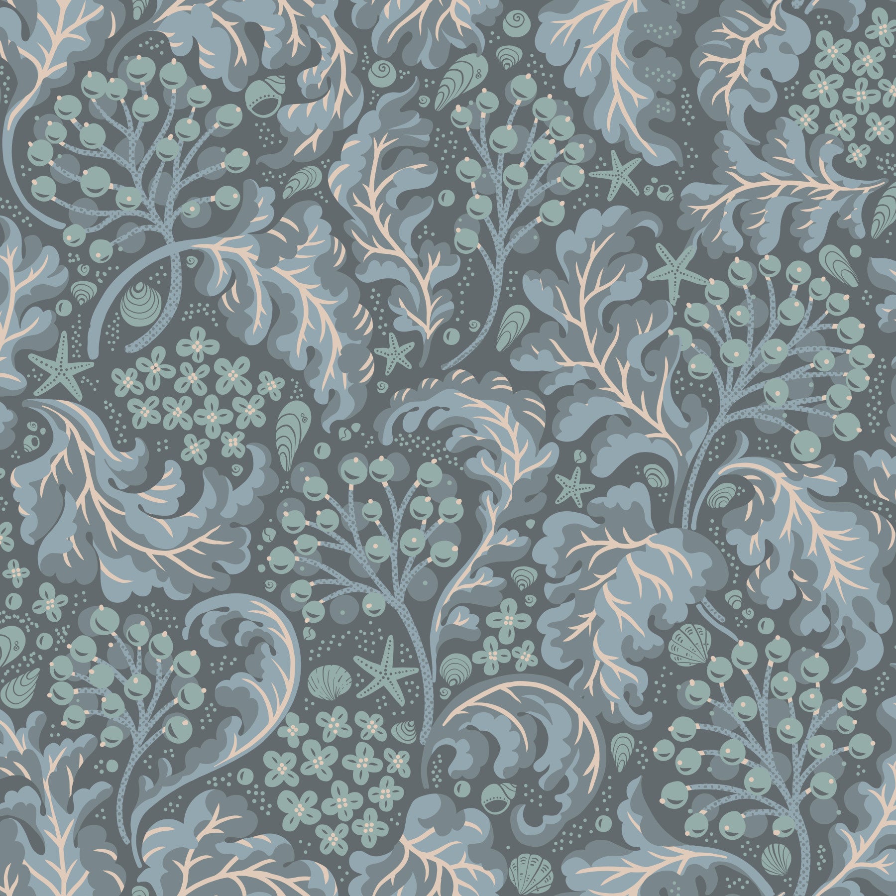 Dive into tranquility with "Sea Kale - Deep Blues," a captivating wallpaper design. Subtle blues and creams create a serene underwater scene, featuring stylized sea kale, delicate flowers, and seashells. The organic forms and calming color palette evoke a sense of peaceful underwater exploration. Perfect for creating a calming atmosphere in any digital space, this wallpaper offers a sophisticated blend of nature and artistry, transforming your screen into a tranquil ocean vista.