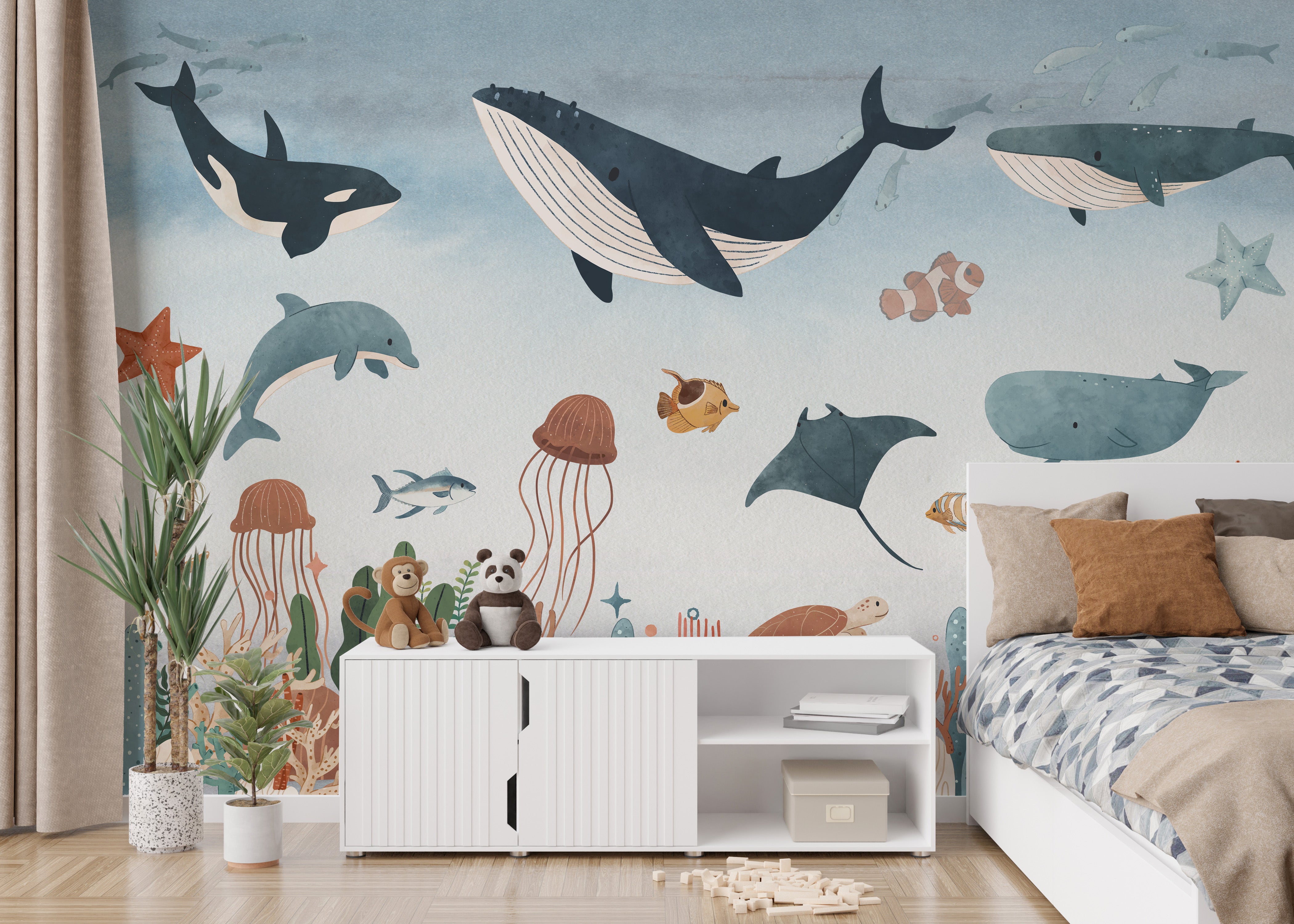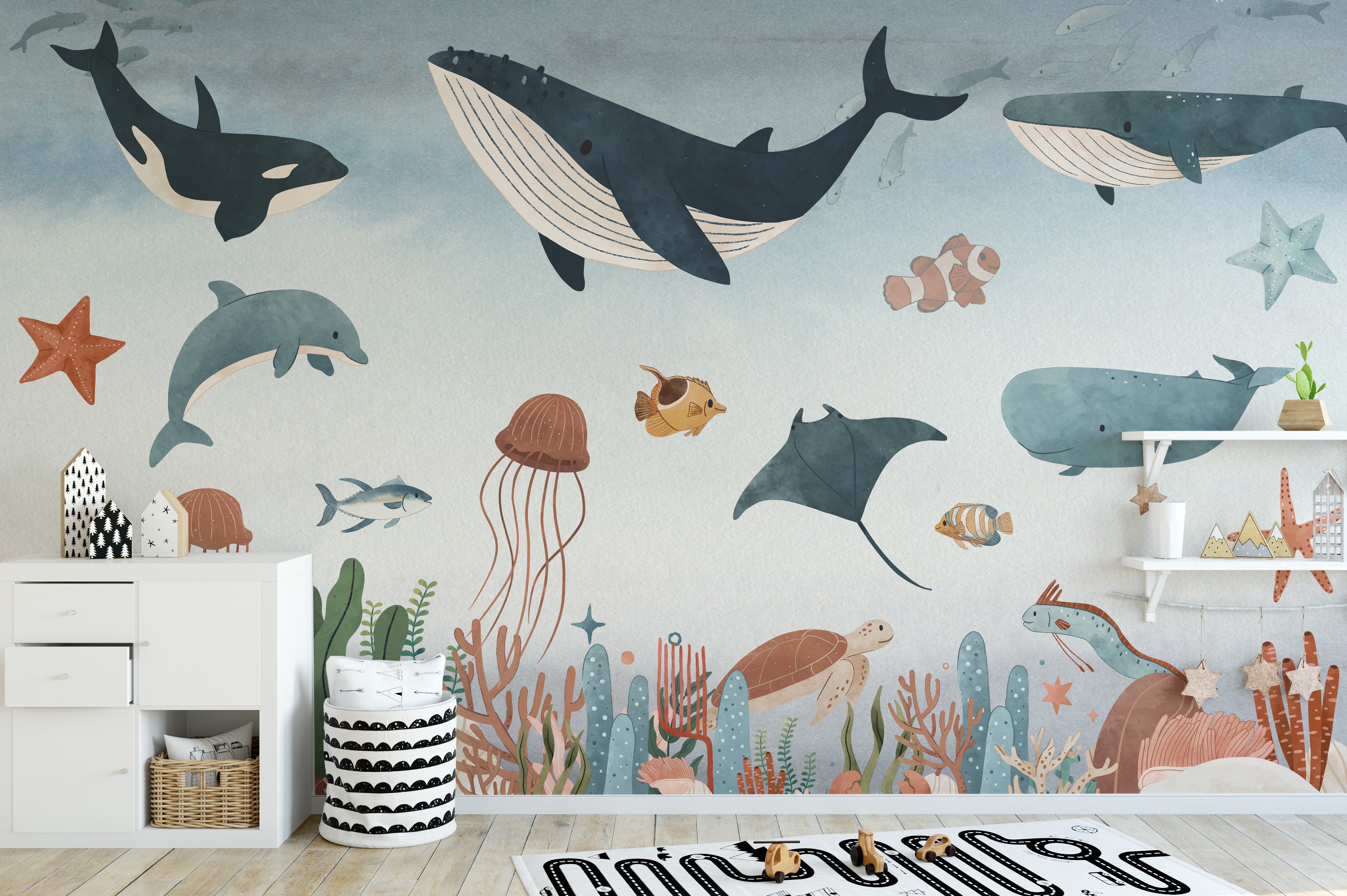 Create an underwater paradise in your kid's playroom with the help of this beautiful mural wallpaper. Please encourage your child's imagination to run wild as they admire the wall filled with vibrant coral reefs, playful fish, and majestic sea creatures. Themural wallpaperwill instantly transport your child to an oceanic world where they can showcase their creativity and let their imagination soar. The intricate and realistic details of the wallpaper will make your child feel like they are swimming underwater, creating a fun and unique atmosphere.