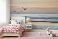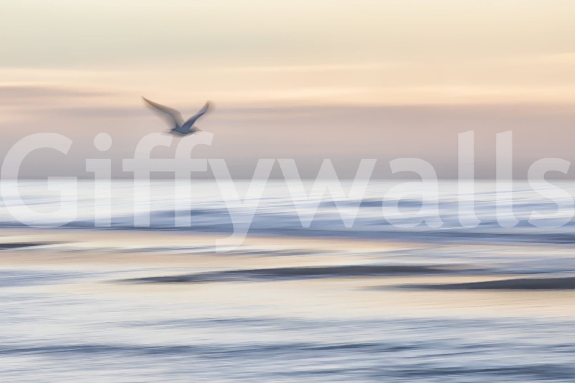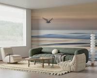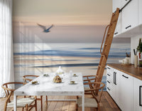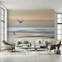 Invite peace into your home with this tranquil scene of a seagull soaring above the water. Soft blues and warm peaches blend, creating a serene coastal feel. This design transforms any room into a calm oasis. This wallpaper for walls complements a bedroom, living room, or even a bathroom, bringing the beauty of the ocean indoors. Create a space that inspires relaxation with this beautiful image.