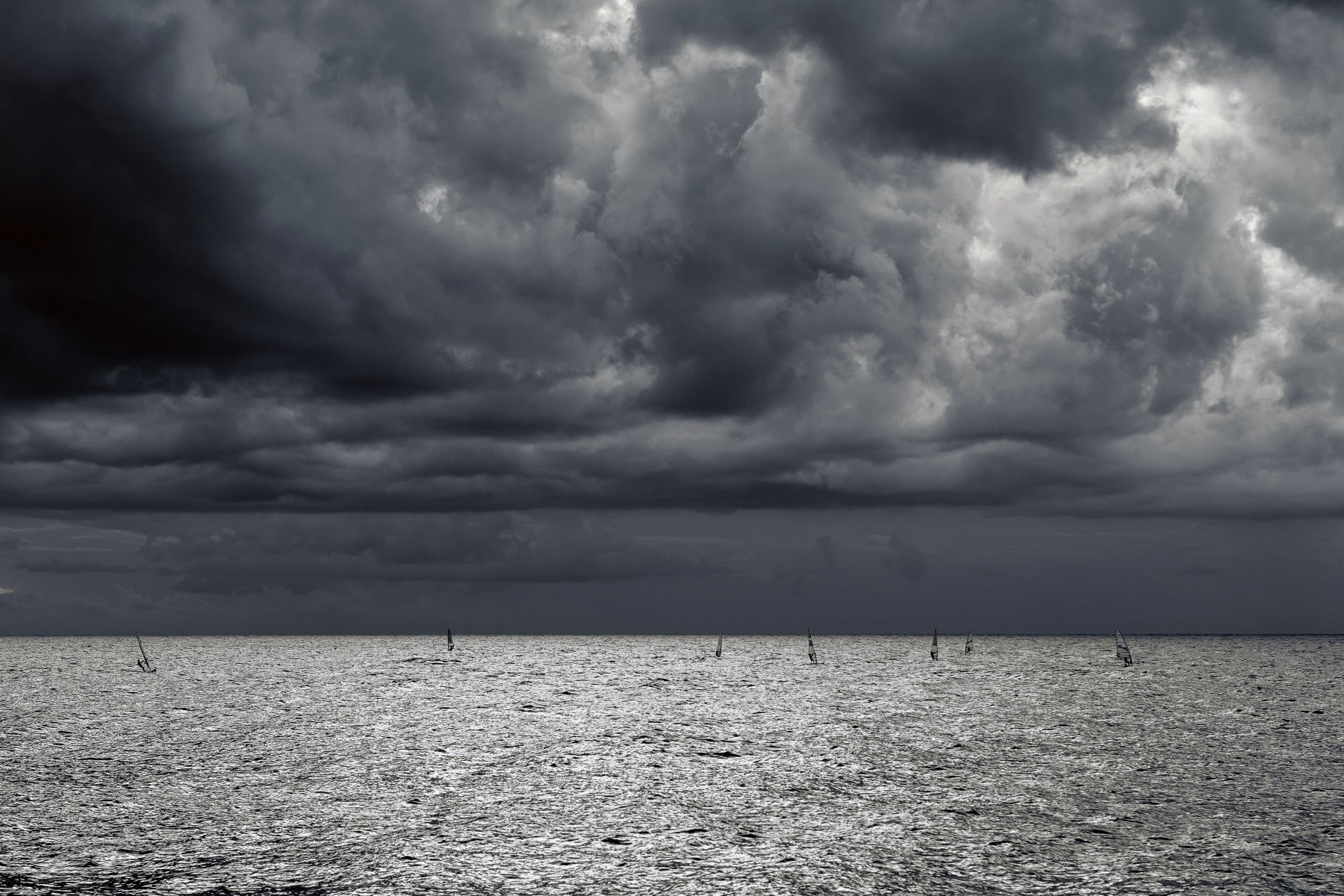 Embrace the power of nature with Storm Riders a dramatic wallpaper that captures the thrilling intersection of human endeavor and the raw force of the elements. Against a backdrop of turbulent, charcoal-colored clouds that dominate the sky, a vast expanse of water stretches towards the horizon. Upon this rippling surface, tiny figures are silhouetted – windsurfers bravely navigating the churning sea. This monochrome masterpiece evokes a sense of awe and intrepid spirit. Feel the rush of the wind and the spray of the water as you bring the energy and intensity of a stormy day at sea to your screen. Perfect for those who appreciate the beauty of dramatic landscapes and the thrill of extreme sports, "Storm Riders" is a bold statement of resilience and adventure.