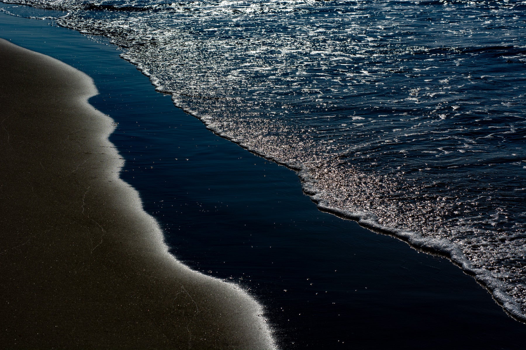 Immerse yourself in the tranquil beauty of Seaside #5 a captivating wallpaper that captures the raw and untamed essence of the coast. This image showcases the dramatic interplay between the dark, textured sands and the shimmering, deep blue sea. The ocean's surface is a mesmerizing canvas of light, reflecting the sun's rays in a dance of sparkling brilliance. Gentle waves roll towards the shore, creating a captivating contrast with the stillness of the beach. The stark contrast between light and shadow evokes a sense of mystery and depth, inviting you to lose yourself in the serenity of the seaside. Bring the calming rhythm of the ocean into your digital space with 'Seaside #5', a perfect blend of nature's power and peacefulness.