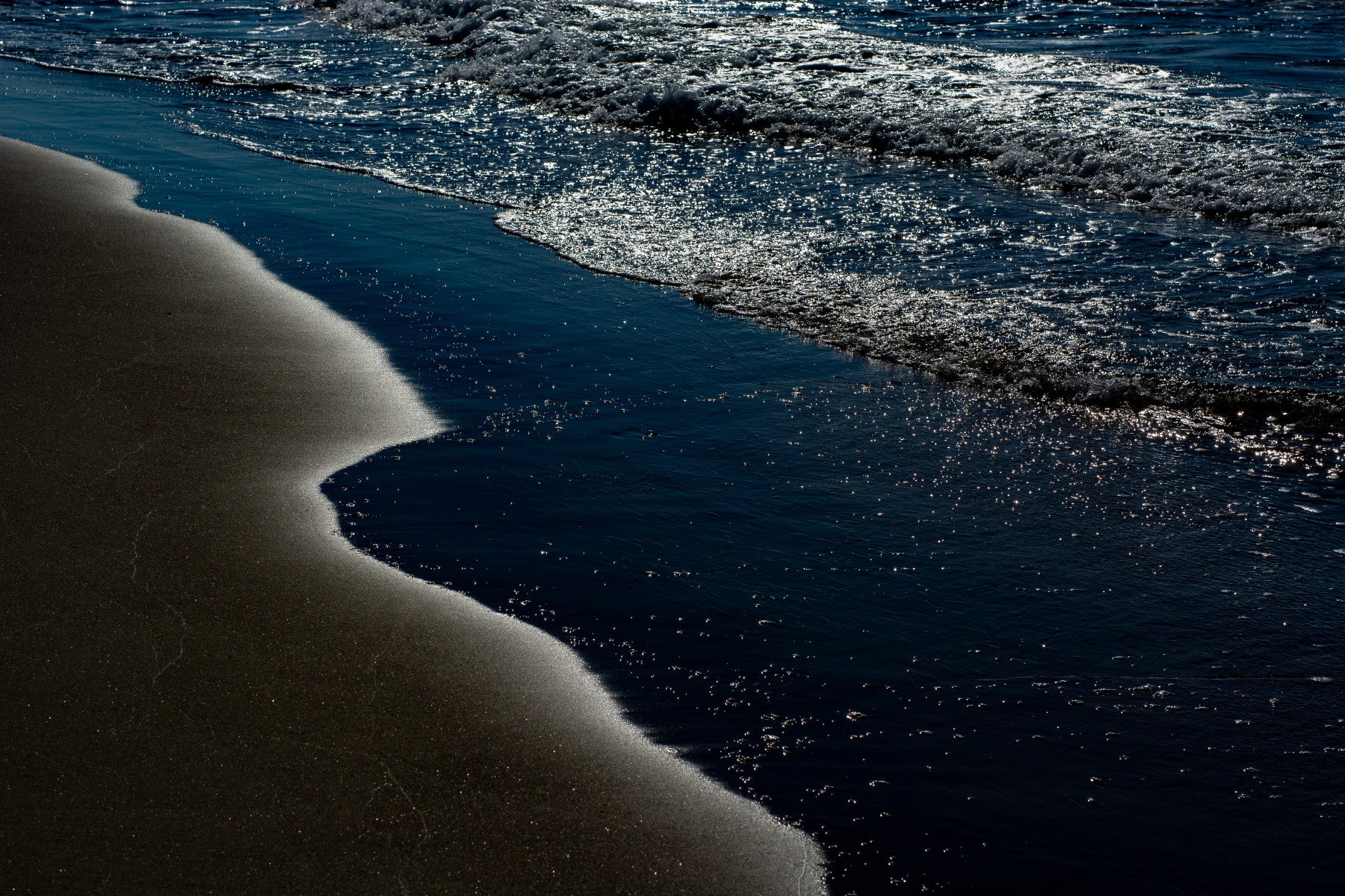 Immerse yourself in the tranquil beauty of Seaside #5 a captivating wallpaper that captures the raw and untamed essence of the coast. This image showcases the dramatic interplay between the dark, textured sands and the shimmering, deep blue sea. The ocean's surface is a mesmerizing canvas of light, reflecting the sun's rays in a dance of sparkling brilliance. Gentle waves roll towards the shore, creating a captivating contrast with the stillness of the beach. The stark contrast between light and shadow evokes a sense of mystery and depth, inviting you to lose yourself in the serenity of the seaside. Bring the calming rhythm of the ocean into your digital space with 'Seaside #5', a perfect blend of nature's power and peacefulness.