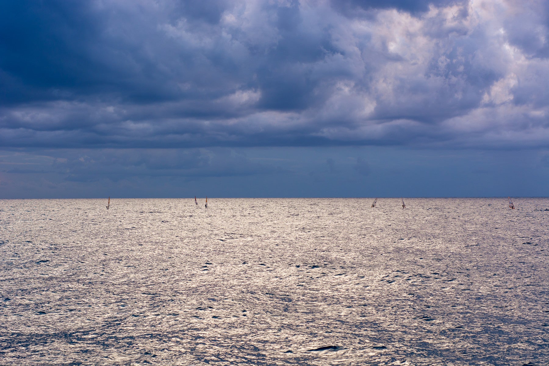 Experience the raw beauty and untamed energy of the coast with Seaside #9. This evocative wallpaper captures a dramatic seascape where the sky is dominated by a canvas of brooding, dark clouds, hinting at an approaching storm. The vast expanse of the sea shimmers with an ethereal glow, its surface subtly textured by the gentle dance of the waves. Silhouetted figures engaged in windsurfing punctuate the horizon, adding a touch of human activity against the backdrop of nature's immensity. Perfect for adding a touch of contemplative beauty and the spirit of adventure to your digital space, "Seaside #9" invites you to lose yourself in the tranquility and power of the ocean.