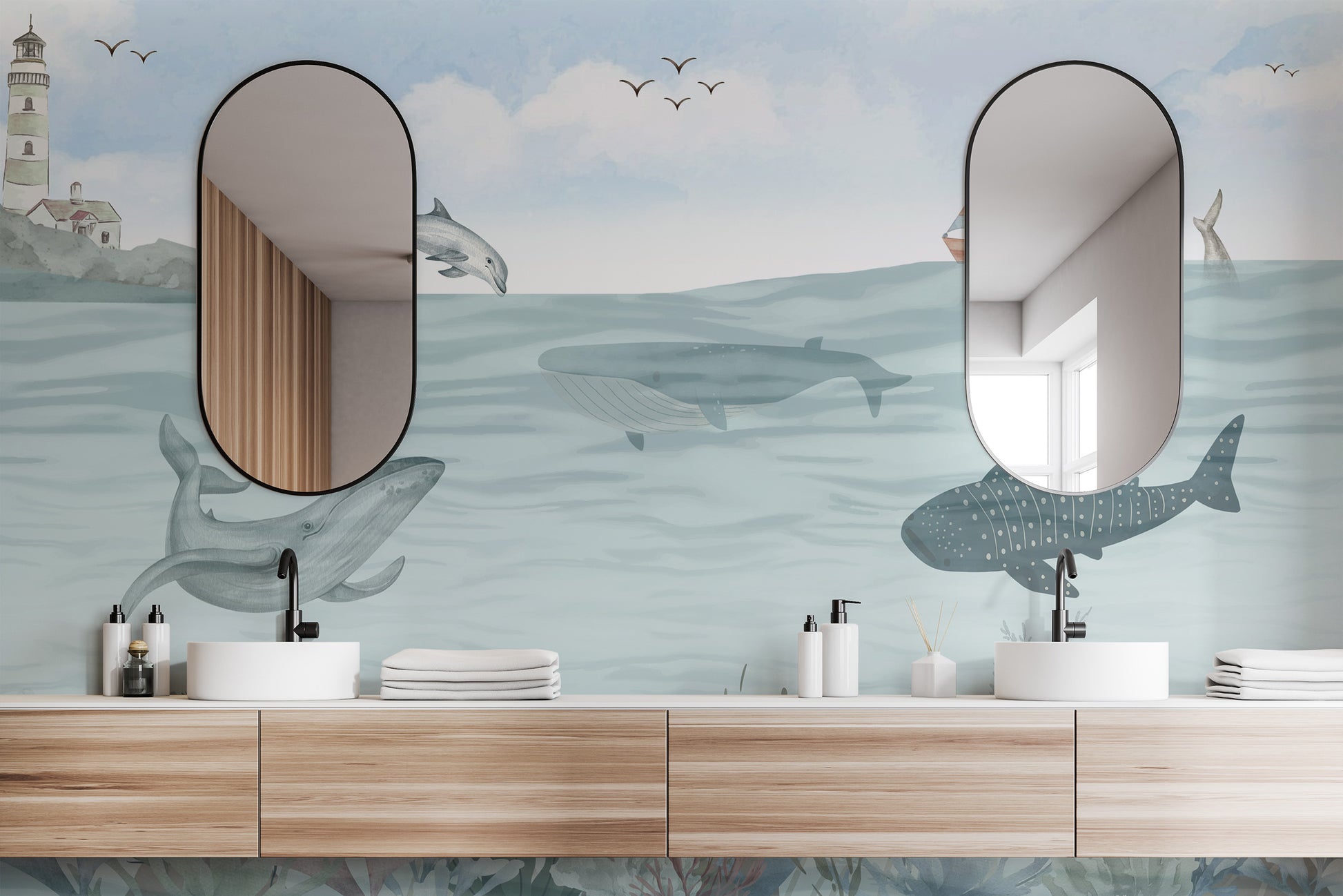 Perfect for a oceanside getaway or a child's playroom, the Seaside Orca Whale Wallpaper is a beautiful design that will help you bring a little peace and serenity into your cramped cityspace. Be inspired by the magical and energetic power of these divine beings in your everyday environment.