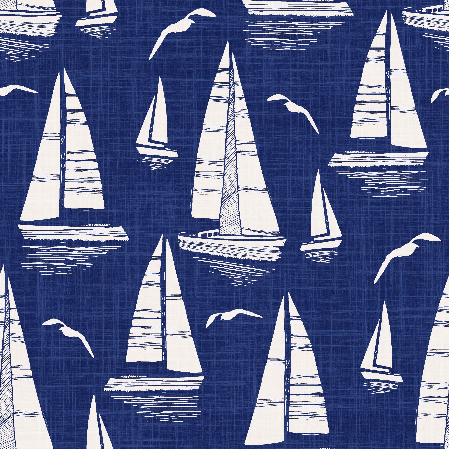 Experience the serene beauty of a seaside regatta with this captivating wallpaper. Elegant off-white sailboats, rendered in a stylish hand-drawn style, glide across a deep navy blue background reminiscent of a calm sea. The textured navy base adds depth and a linen-like feel, enhancing the nautical theme. Seagulls in flight add a touch of dynamic movement against the peaceful backdrop, creating a balanced and sophisticated seascape perfect for any room. This design evokes a sense of tranquility and timeless coastal charm. The crisp white against the rich blue provides a visually striking contrast, making it an ideal choice for modern or classic interior design schemes.