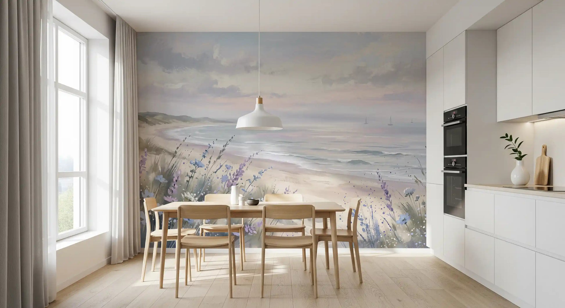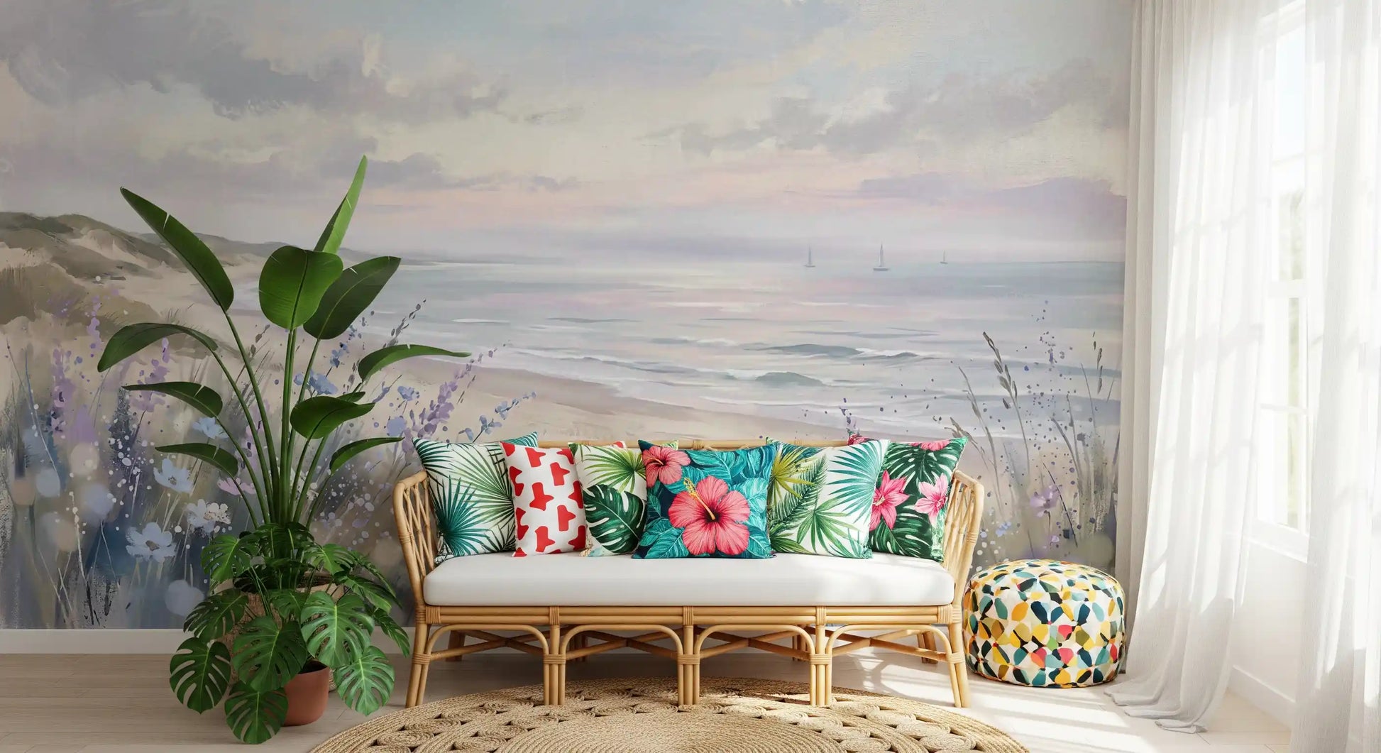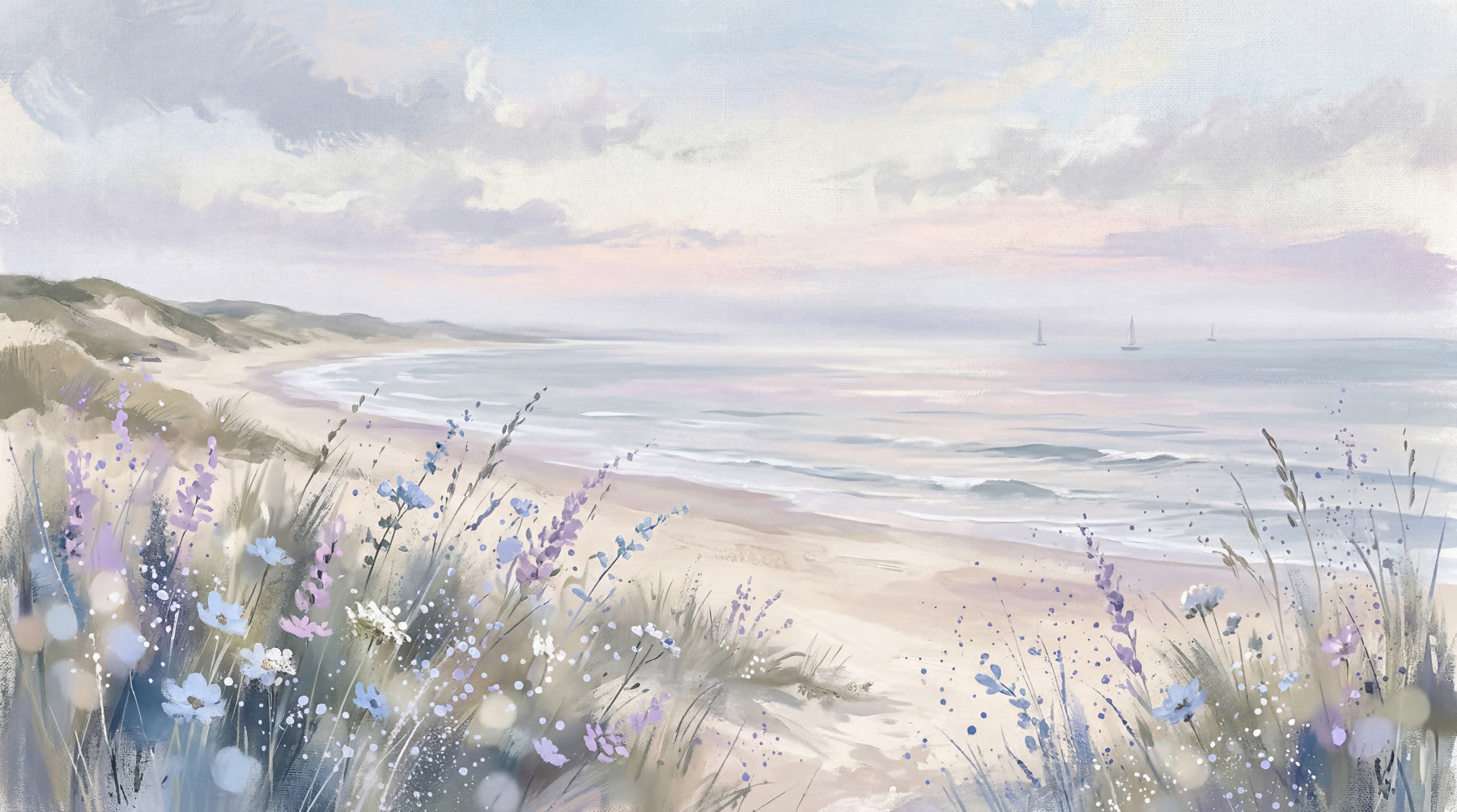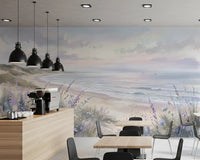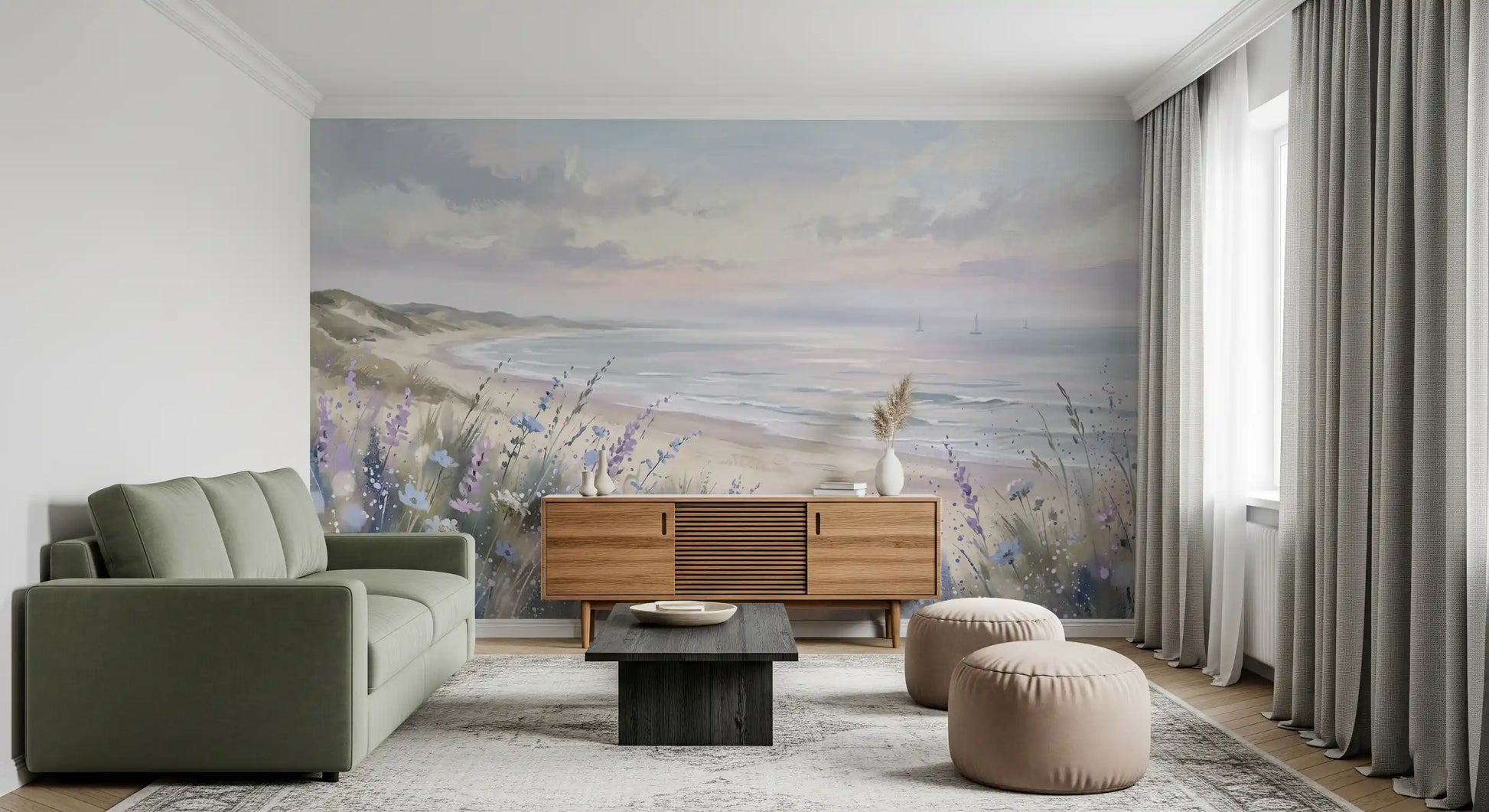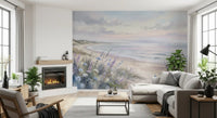 Transform your living space with this exquisite wallpaper for walls, capturing the tranquil beauty of a coastal landscape. Delicate brushstrokes create a serene scene featuring soft dunes, a gentle, lapping ocean, and distant sailboats under a pastel sky. A foreground of charming wildflowers in lavender and soft blue hues adds depth and organic elegance. The ethereal color palette blends soothing blues, subtle purples, and warm sandy tones, evoking a peaceful dawn or dusk. This painterly design brings a calm, expansive ambiance to any room. It works beautifully in bedrooms, living rooms, or serene bathrooms, offering a quiet escape and complementing a relaxed interior style. This design infuses spaces with natural beauty and a dreamy coastal charm.
