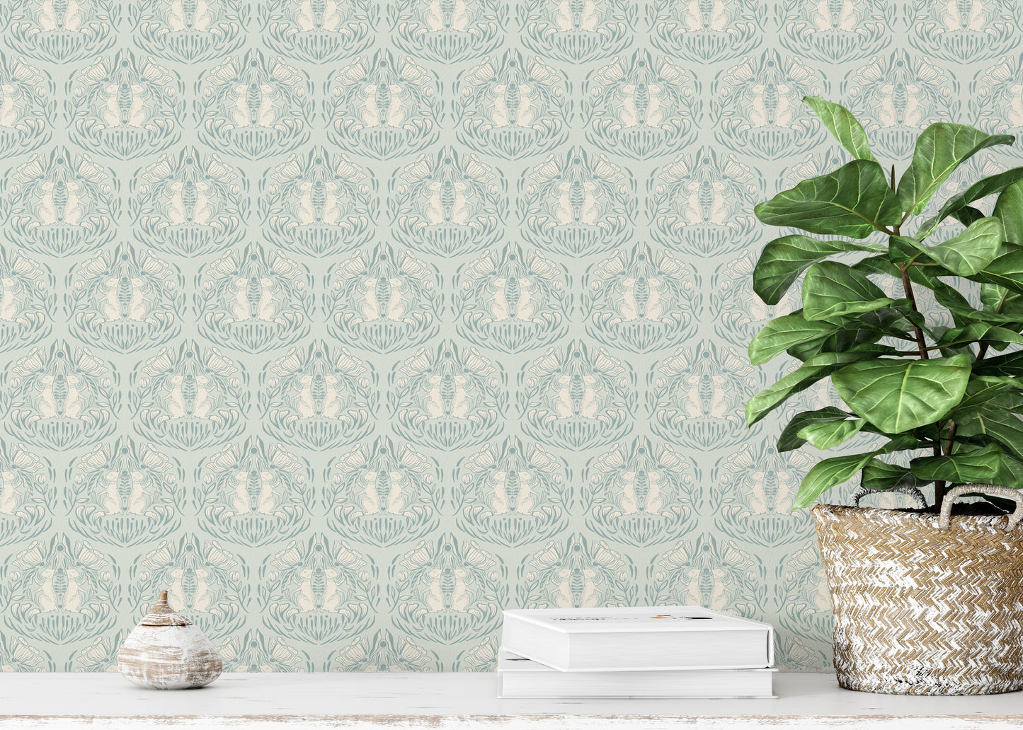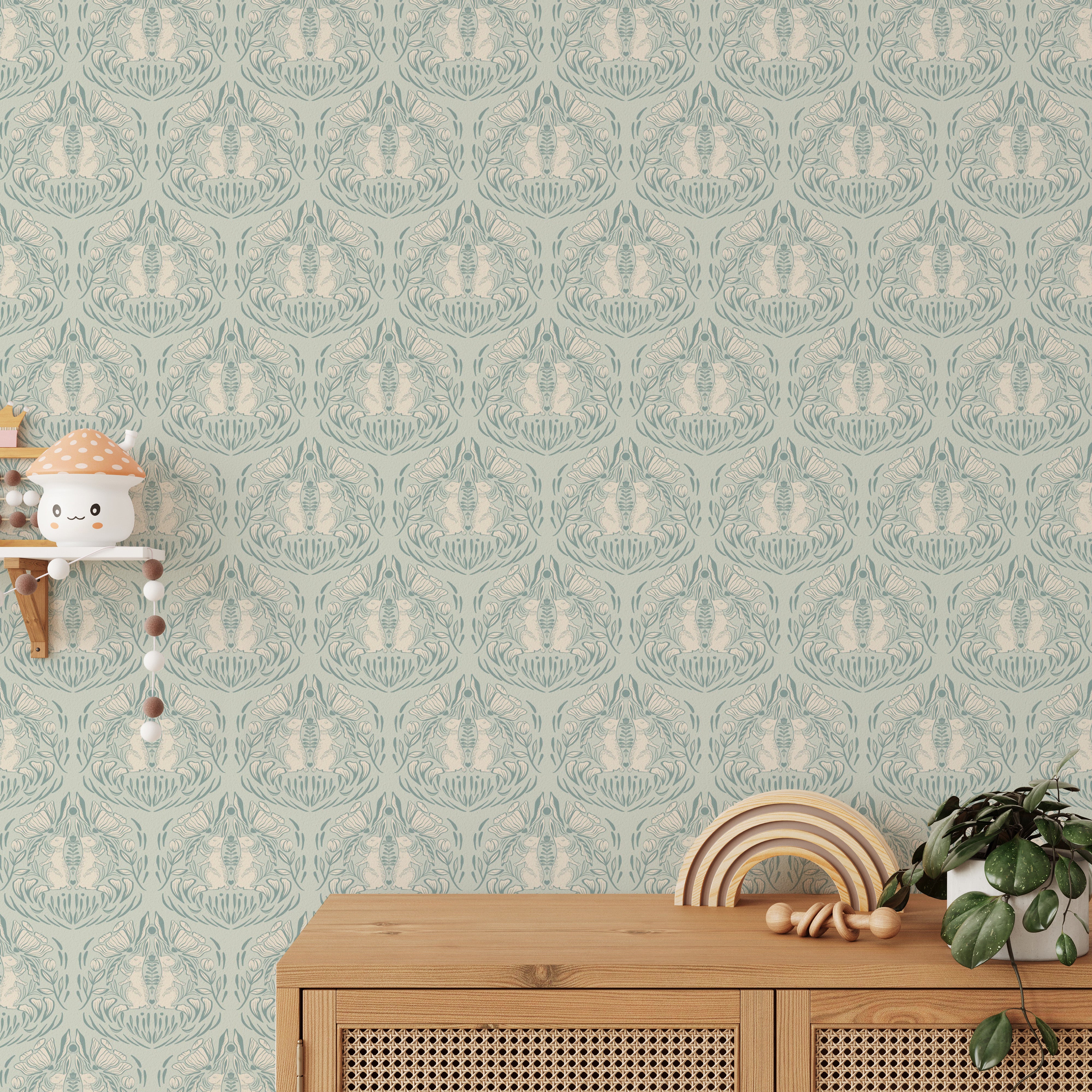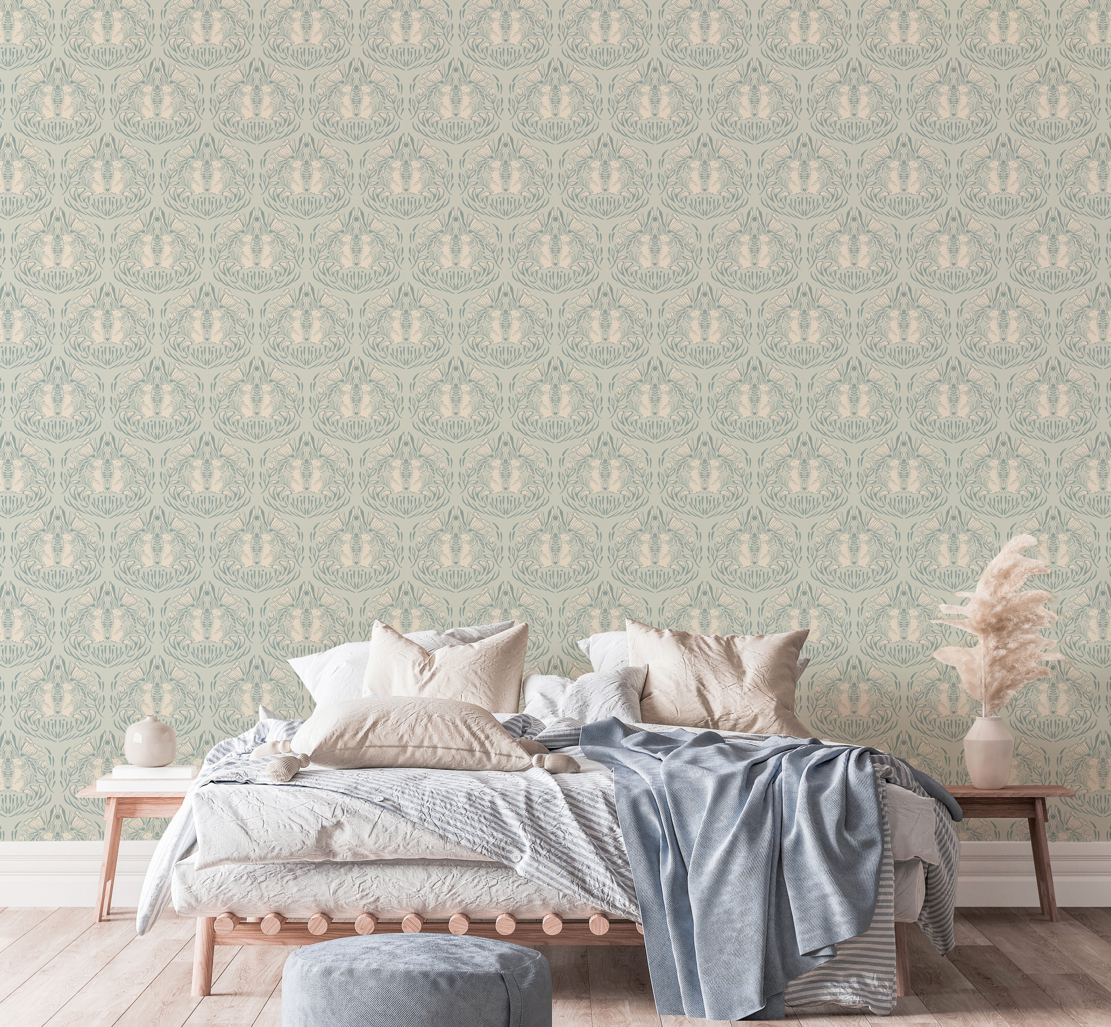Step into a storybook scene with Poppy and the Hare – Misty Meadow wallpaper. This whimsical design features mirrored illustrations of hares nestled among poppy petals, foliage, and natural elements, all drawn in soft sage and cream tones. The repeating pattern brings charm and character to nursery rooms, play areas, or cozy reading nooks. The hand-drawn style adds a unique artistic feel, while the light, misty background keeps the room feeling open and airy. Perfect for anyone looking to include woodland-inspired wall design with a gentle and imaginative touch, this wallpaper for walls adds quiet personality and playful detail.