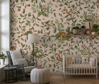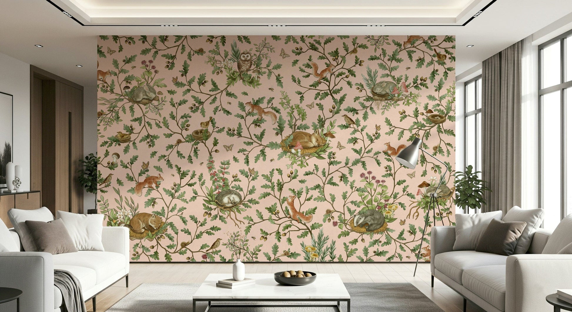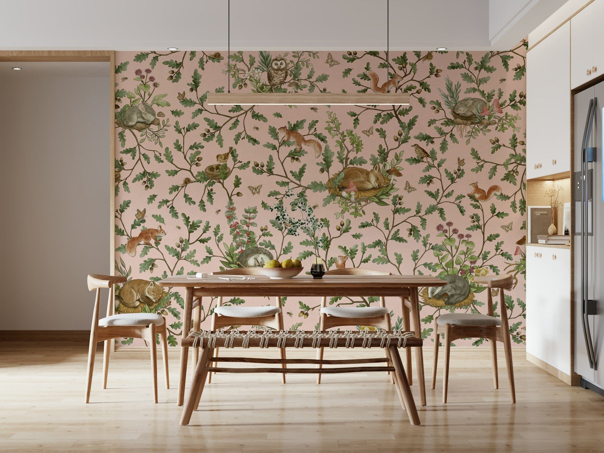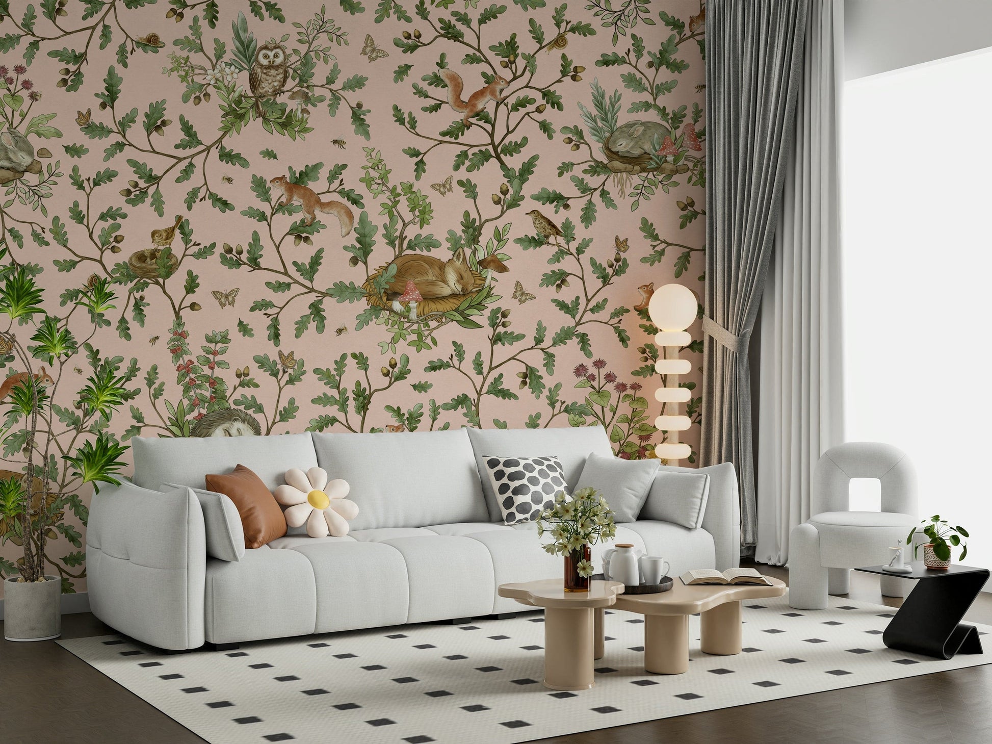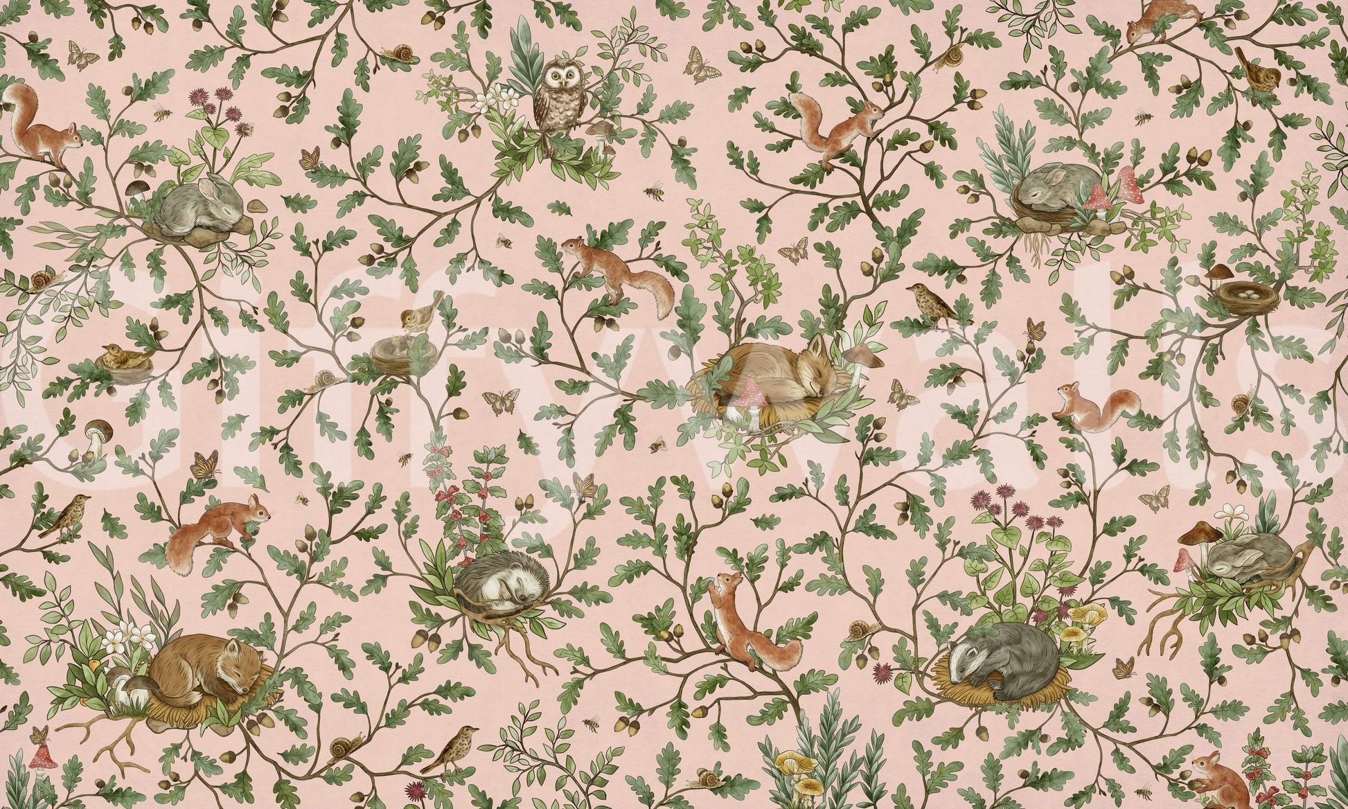Discover a magical haven with this enchanting wallpaper for walls. Featuring forest creatures nestled within a detailed tapestry of oak branches and leaves, this design brings the quiet beauty of nature indoors. The muted colour palette of pinks and greens creates a relaxing atmosphere, ideal for a bedroom or nursery. Its intricate details and timeless charm will add a touch of sophistication and a storybook feel to your home. Decorate your walls with this classic wallpaper.