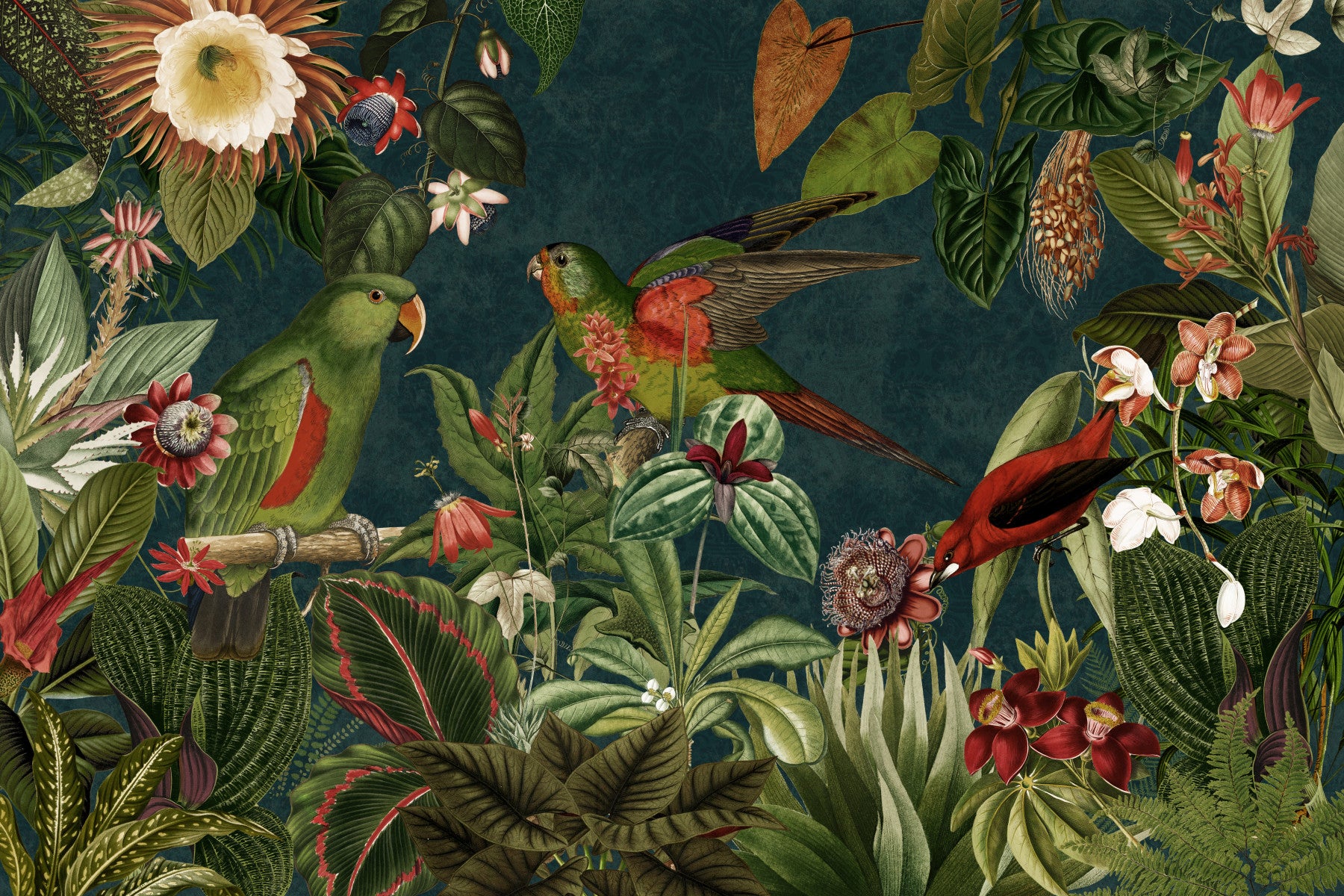 Discover the hidden beauty of the tropics with this captivating wallpaper. The design features a meticulously detailed arrangement of lush, exotic foliage and vibrant flowers in a rich palette of greens, reds, and oranges. Three striking parrots are interwoven into the design, adding a sense of playful energy to the scene. The deep teal background provides a luxurious contrast, highlighting the intricate details and rich colors. This wallpaper creates a tranquil and inviting atmosphere, perfect for adding a touch of exotic elegance to any space. It's a visual journey into a secret world of vibrant life and hidden wonders.