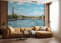 Bring the charm of Parisian waterways into your home. This wallpaper for walls presents a captivating view of the Seine River, complete with tour boats and historic bridges. The serene scene can enhance any room with a touch of European elegance. This scenic print boasts a palette of blue, green, and beige to easily match your existing decor. Consider it for a sophisticated office or a relaxing bedroom. The river's reflection adds a subtle, calming element that perfectly balances a room.