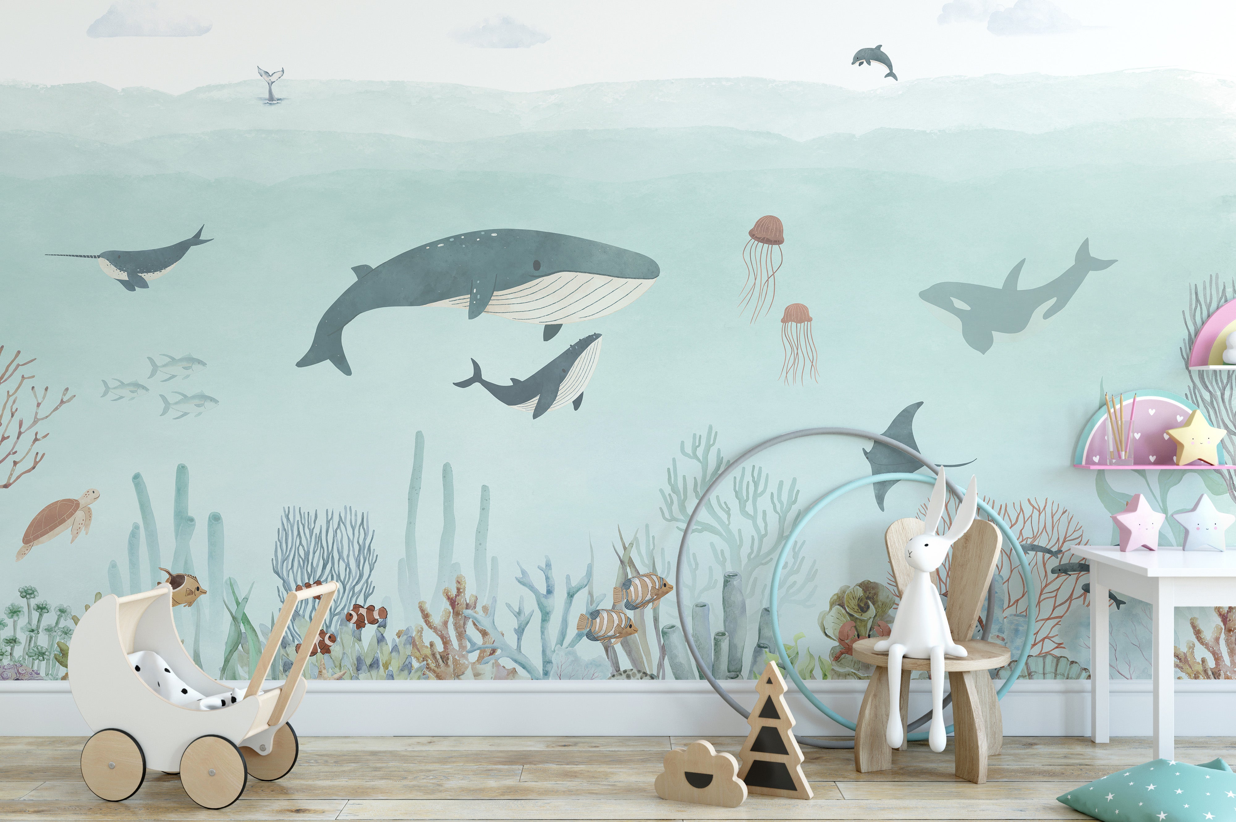 Sensational sea wallpaper mural brings the captivating beauty of the ocean right into your home. This stunning underwater wallpaper features a serene marine scene with whales, jellyfish, and vibrant coral reefs, creating a breathtaking focal point for any room. Perfect for ocean enthusiasts, the mural adds a touch of nature's wonder to your walls, providing a calming and refreshing environment. Easy to apply and made from high-quality materials, it ensures durability and longevity. Transform your living space with this unique underwater wallpaper and experience the tranquillity of the sea every day.