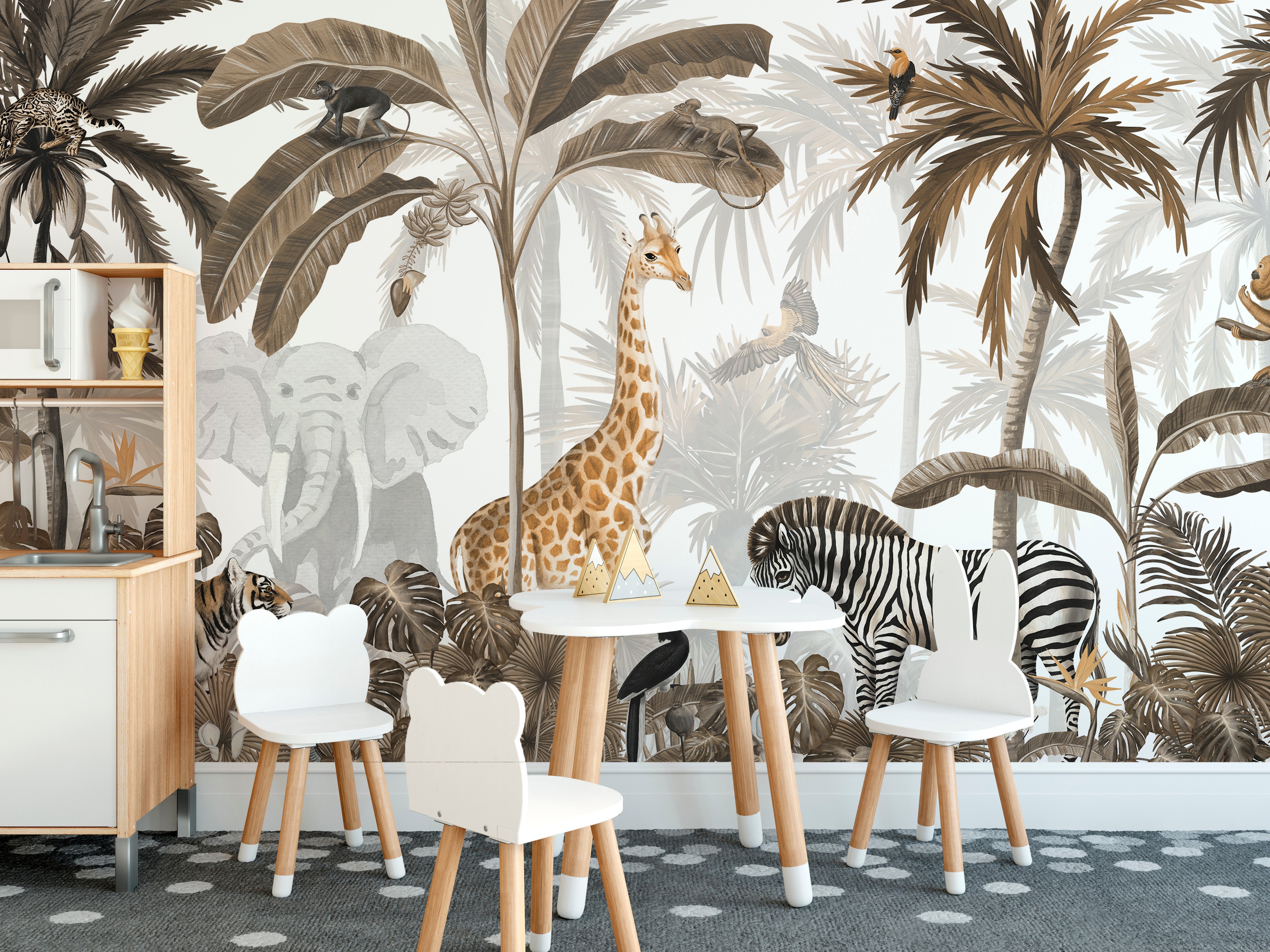 Embark on a jungle adventure with our Tropical Jungle Wild Animals Trees Wallpaper Mural. This vibrant jungle animal wallpaper mural brings the lush, untamed beauty of the jungle to your home, featuring a rich tapestry of wild animals and exotic trees. Perfect for creating an immersive escape into nature, the mural's vivid colors and dynamic scenes capture the spirit of adventure and exploration. Transform any room into a tropical paradise, where the thrill of the wild awaits at every glance. Ideal for those craving a bold and exciting addition to their decor.
