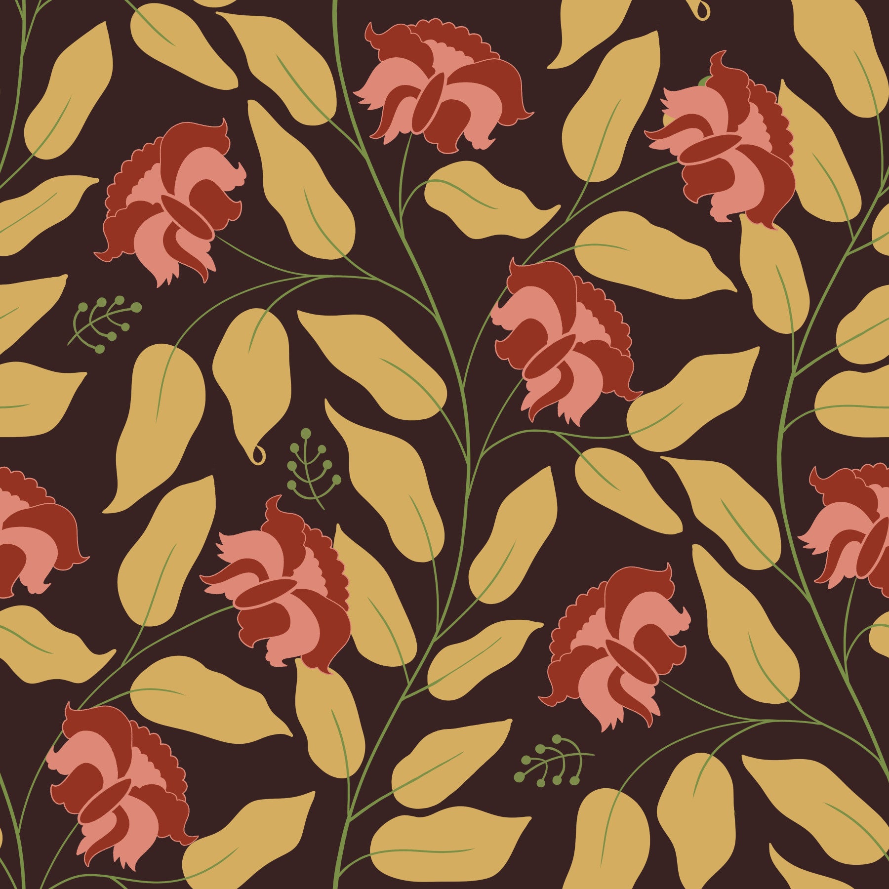 Immerse yourself in the tranquil beauty of Seraphyne - Rustic Bloom Echo a wallpaper that whispers tales of timeless elegance and pastoral charm. This design showcases stylized, yet organically shaped, blooms in muted terracotta and blush tones, artfully contrasted against a rich, grounding chocolate brown backdrop. Golden, elongated leaves weave through the design, evoking a sense of autumnal harmony and gentle decay, hinting at nature's cyclical renewal. The subtle, stylized berries add delicate details, complementing the floral composition. 'Rustic Bloom Echo' embodies a vintage aesthetic with a contemporary twist, perfect for adding a touch of sophisticated warmth to any space. Its earthy color palette creates a soothing atmosphere, making it ideal for bedrooms, living rooms, or any area where you seek a calming and inviting ambiance. Let 'Seraphyne' transform your walls into a canvas of understated beauty, resonating with the echoes of a blooming, bygone era.
