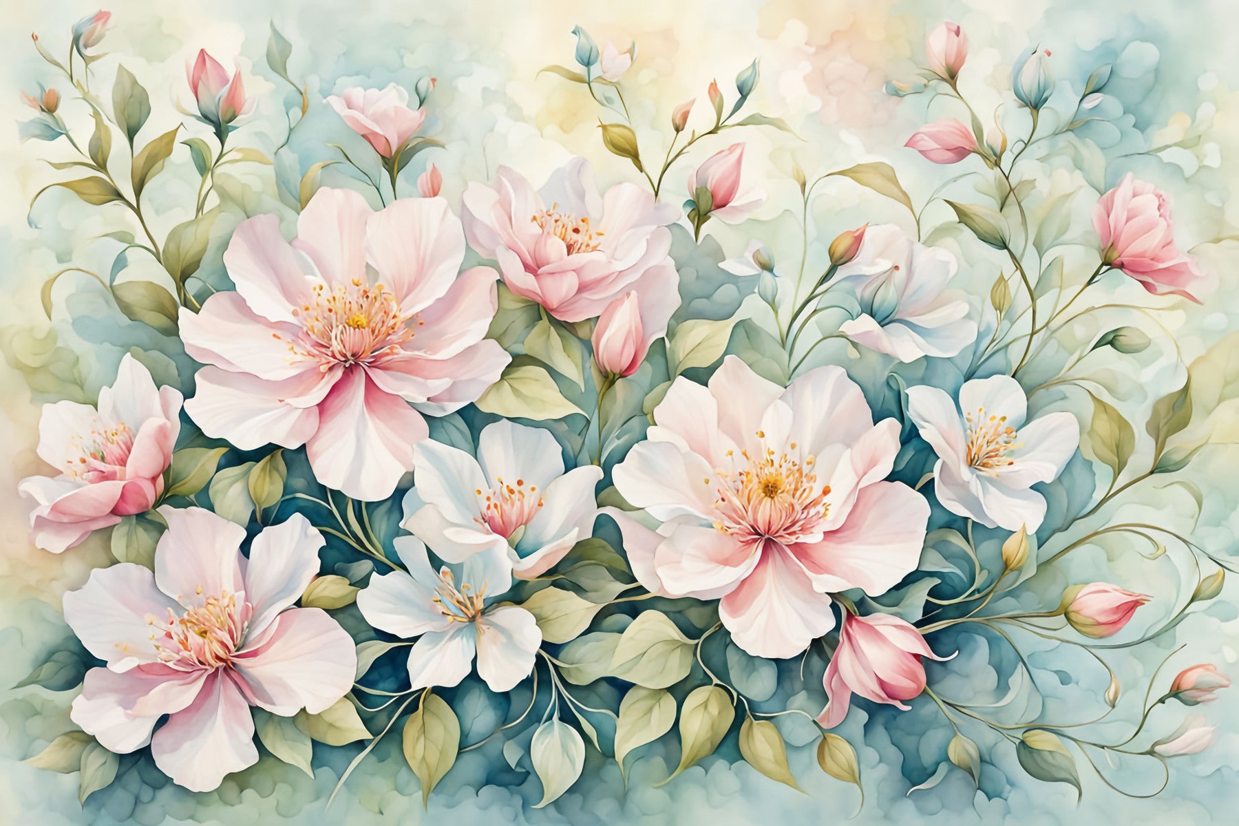Transform any room with this beautiful floral wallpaper for walls. It shows a stunning mix of soft pink and white blossoms, complete with lush green foliage and a gentle watercolor effect. This design creates a calm atmosphere that is great for bedrooms, nurseries, and hallways. The light, airy design enhances spaces, while its tranquil color palette complements a variety of interior styles. The delicate details and flowing lines bring an element of sophistication and freshness to your home.