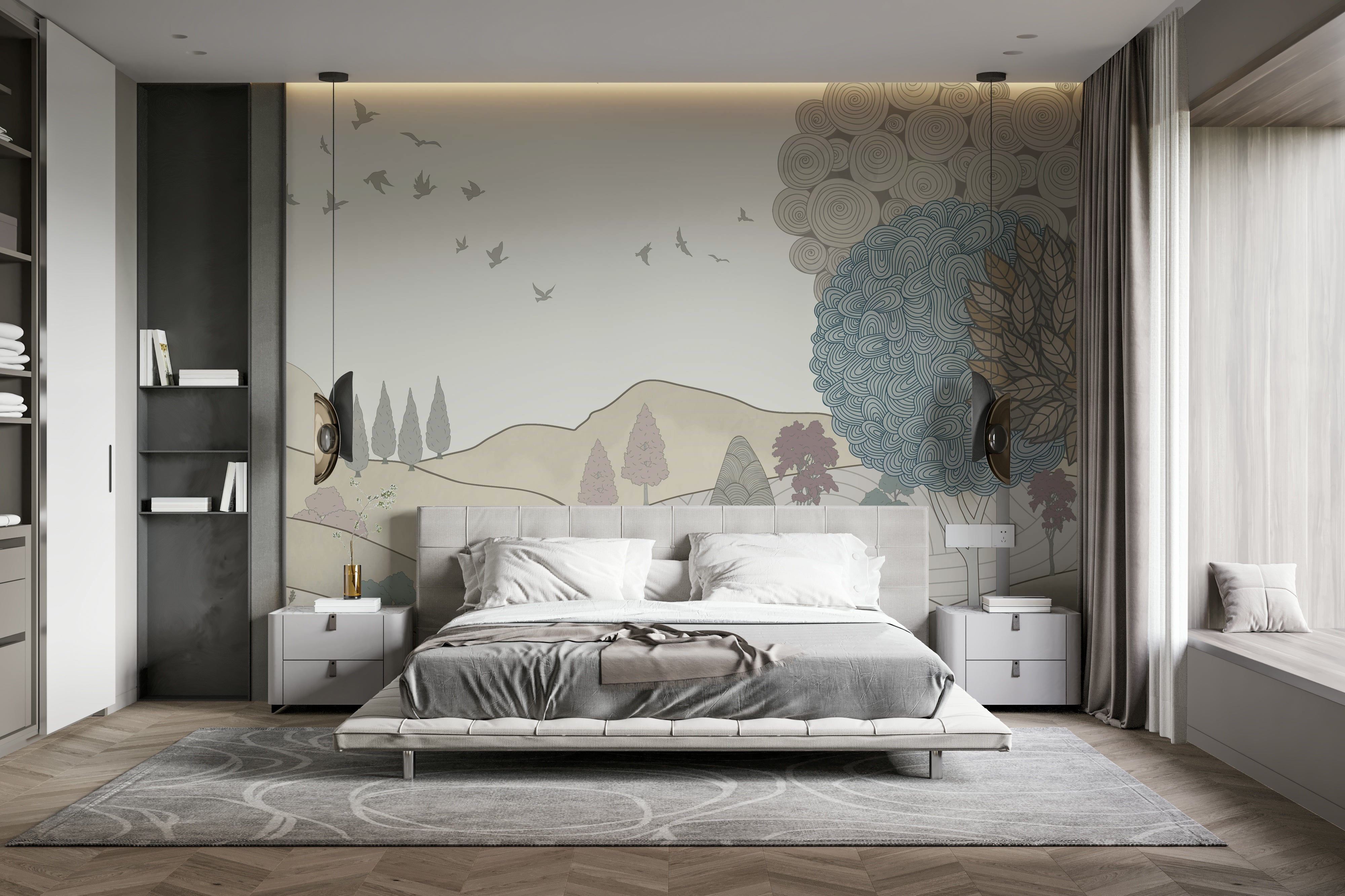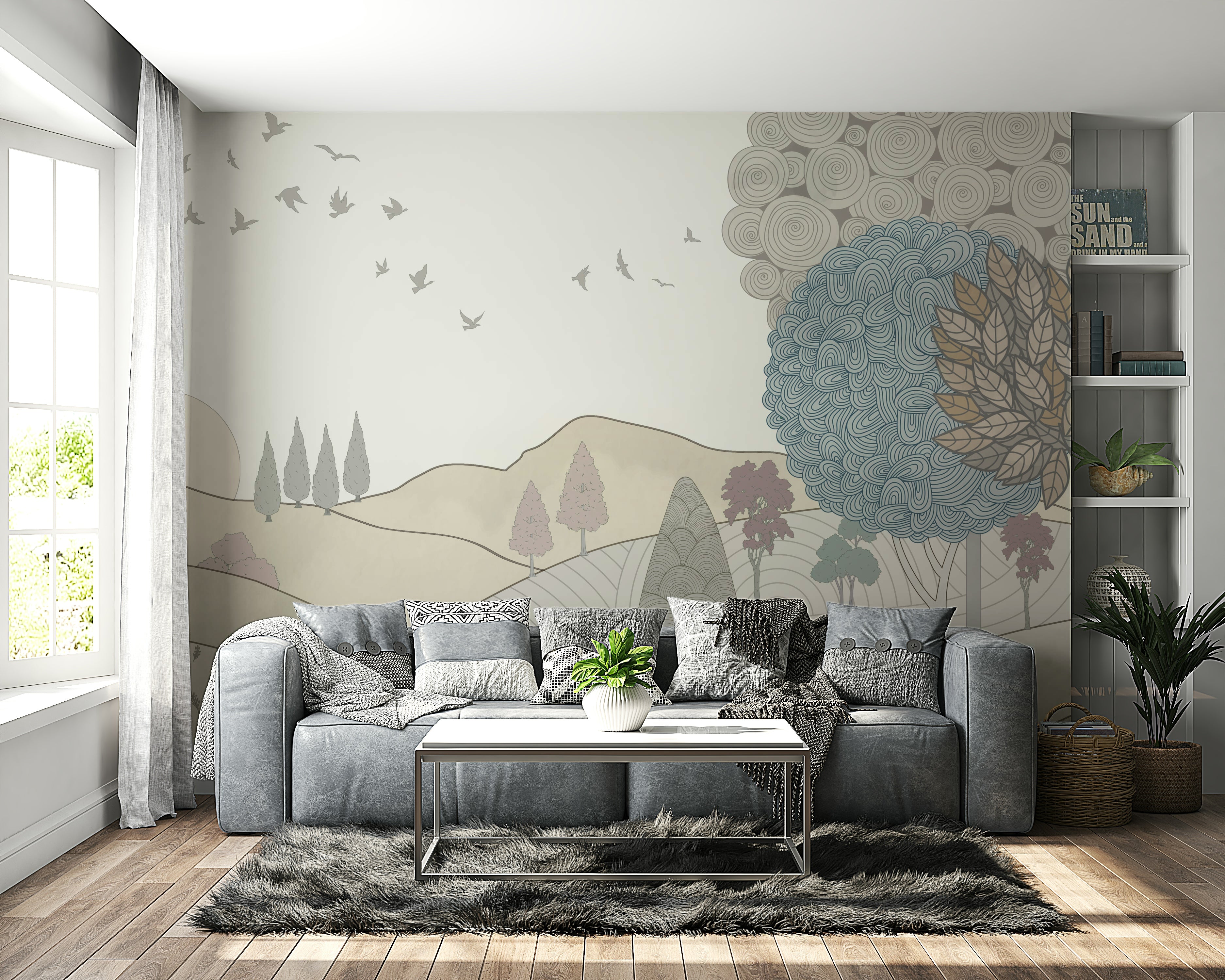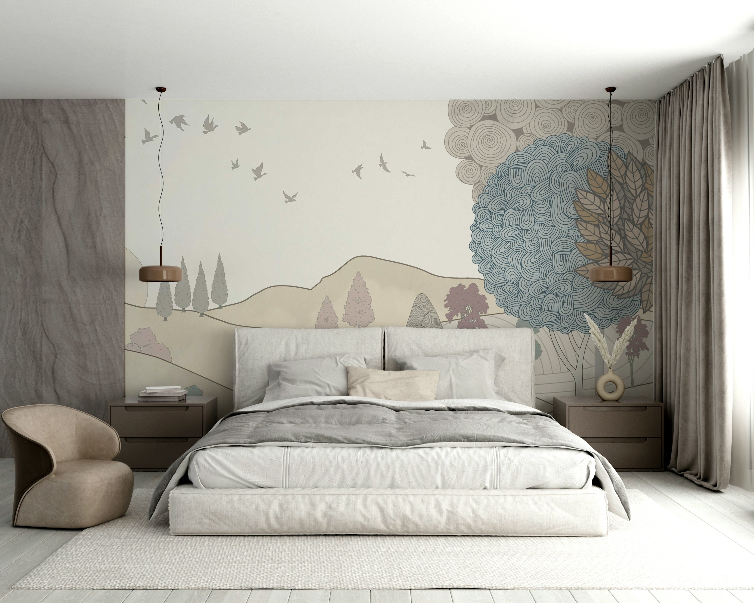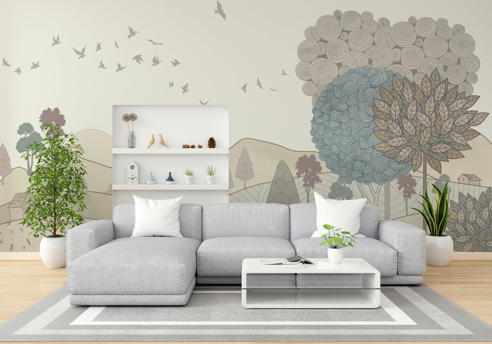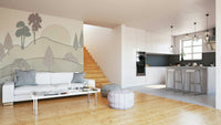 This wallpaper transports you to a picturesque countryside, rendered in a soft, dreamy style. Delicate linework defines rolling hills, whimsical trees with swirling patterns, and a profusion of lavender and other wildflowers. The overall color palette is muted and peaceful, combining shades of beige, grey, and pale lavender. The inclusion of a small house adds a cozy touch, enhancing the feeling of tranquility and escape. Perfect for creating a serene and calming atmosphere in any room.
