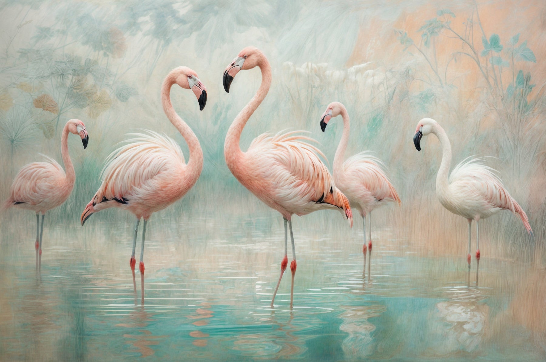 This stunning wallpaper captures the ethereal beauty of a flock of flamingos gracefully wading in a tranquil lagoon. The soft, pastel hues of pink and teal create a calming and dreamy atmosphere. Delicate brushstrokes depict a misty background, enhancing the overall sense of peace and tranquility. The artistic rendering of the flamingos, with their elegant postures and vibrant colors, evokes a feeling of serenity and natural wonder. This wallpaper is perfect for creating a relaxing and sophisticated ambiance in any room of your home.