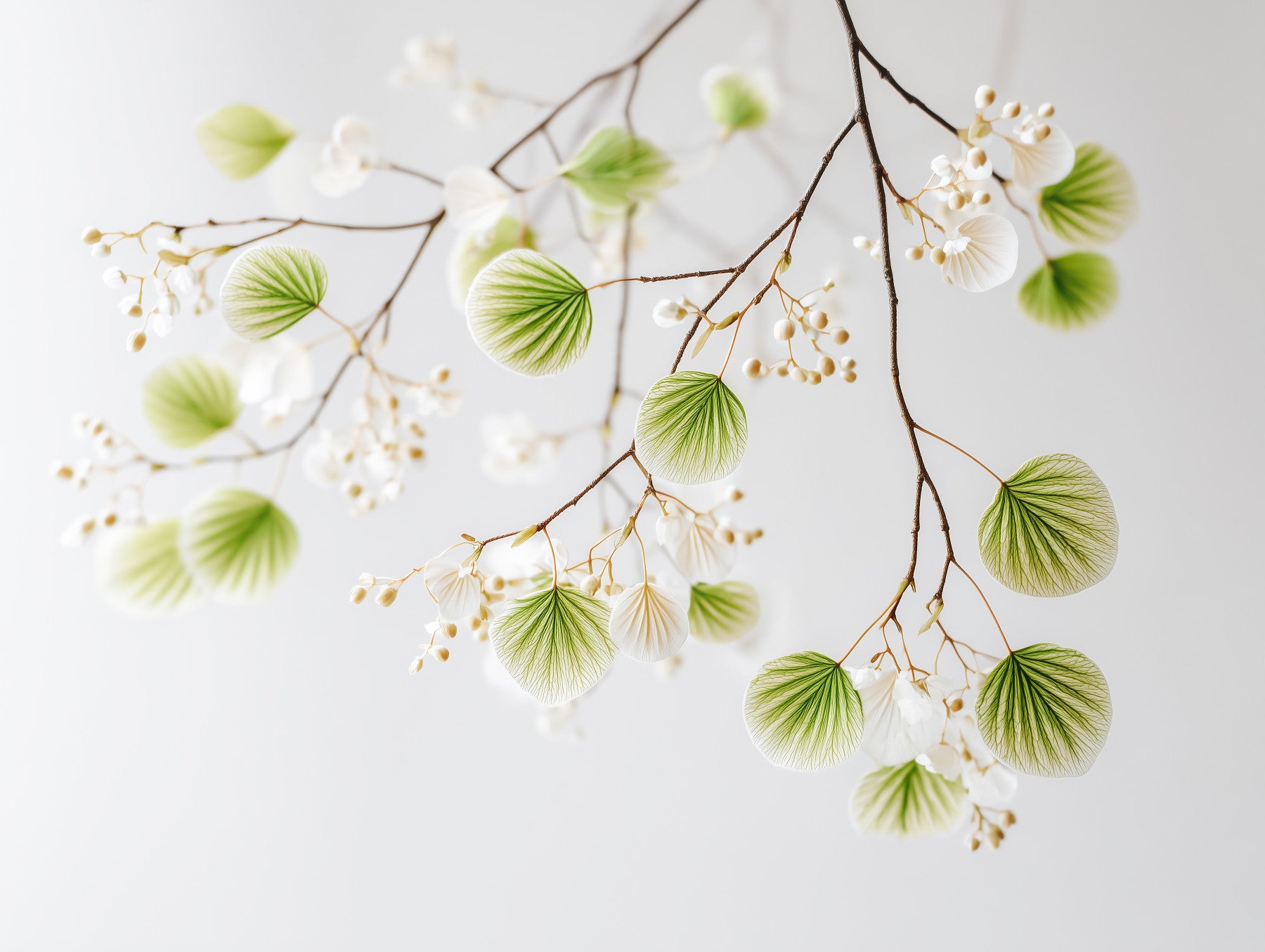 Transform your space with this refined botanical wallpaper. Featuring delicate branches with light green striped leaves and soft white blossoms, this design radiates a calm energy. The light and airy color palette opens up any room, making it suitable for bedrooms, living rooms, or offices. Install this wallpaper for walls to create a tranquil atmosphere, as the intricate leaf patterns complement minimalist and modern interiors alike. Refresh your home with a touch of subtle elegance.